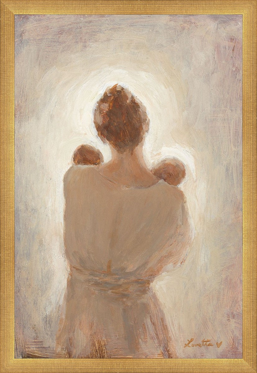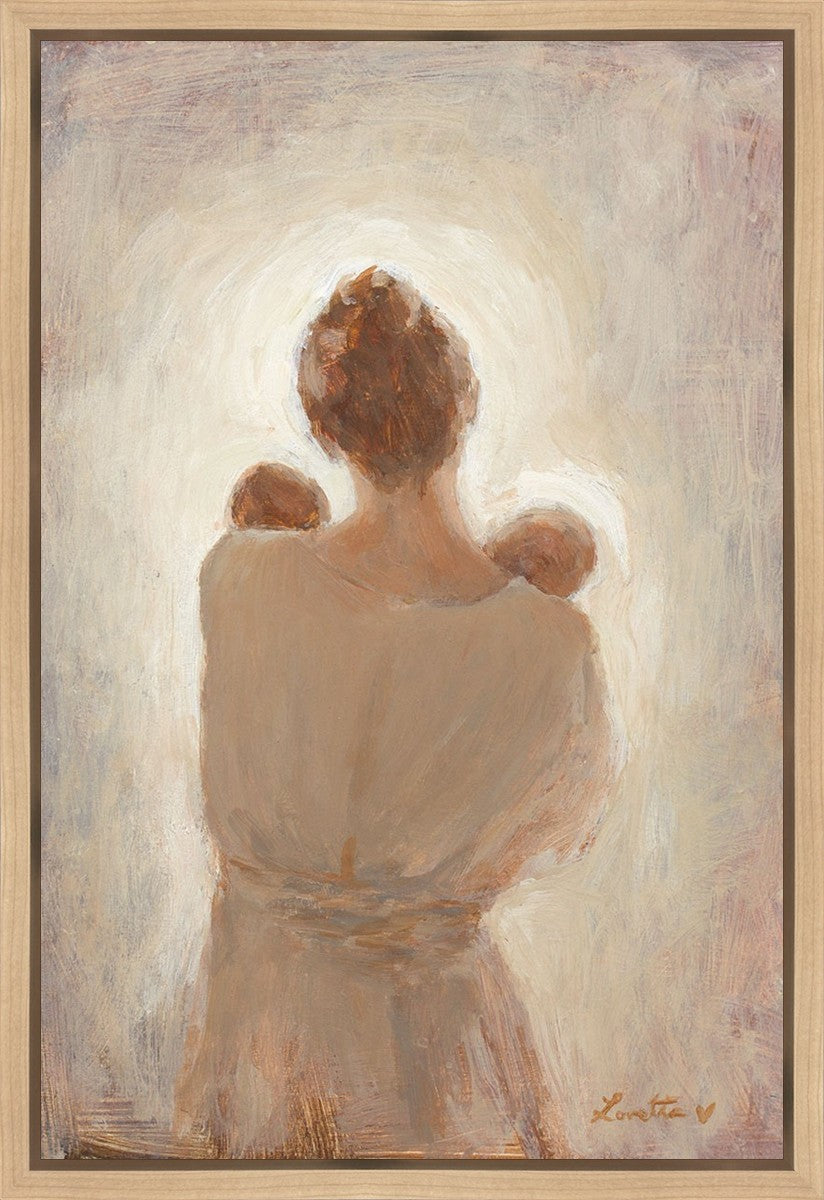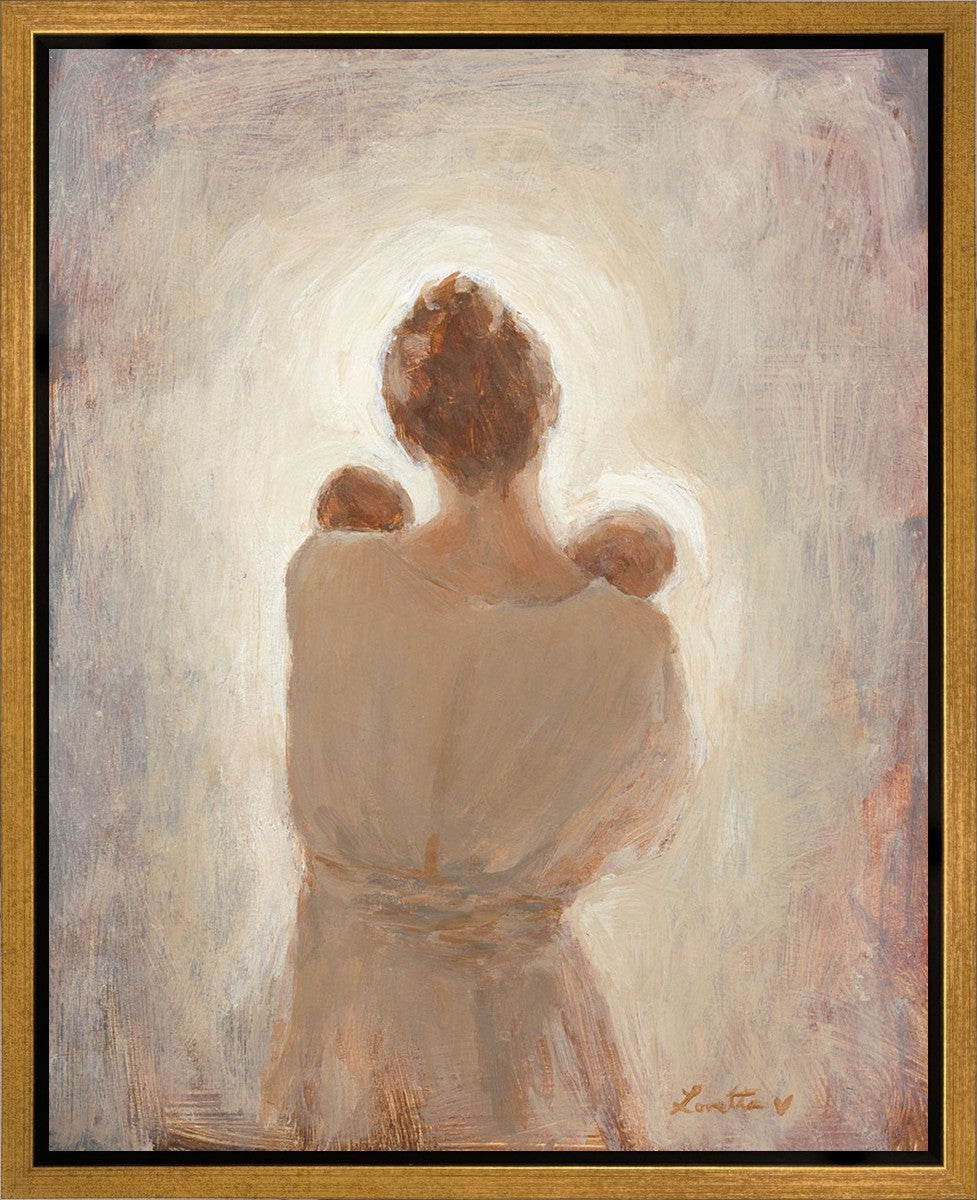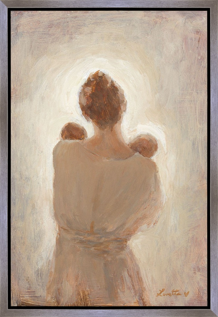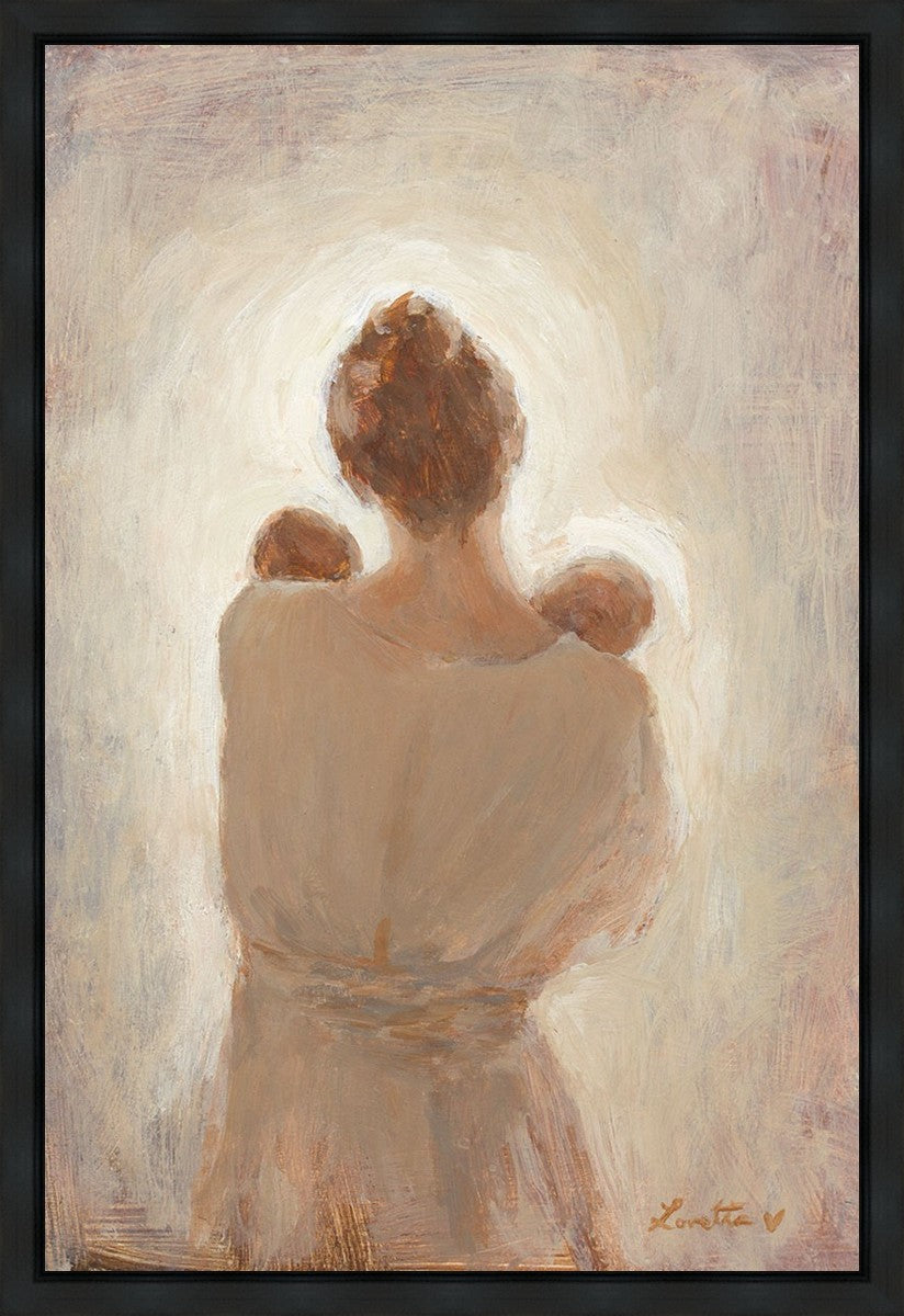 Two Little Loves" by Lovetta Reyes Cairo is a heartwarming painting portraying a mother holding her newborn twins against a soft pink background. This captivating artwork captures the beauty of motherhood and the bond between parent and child, making it perfect for nurseries and spaces celebrating the joy of new life. Immerse yourself in the tender embrace depicted in this artwork, ideal for those seeking inspiration and comfort in the journey of parenthood.