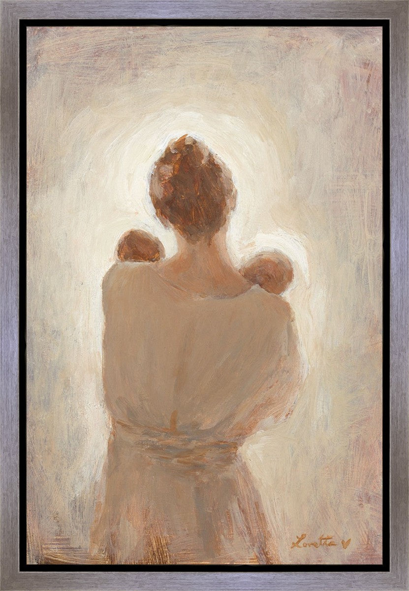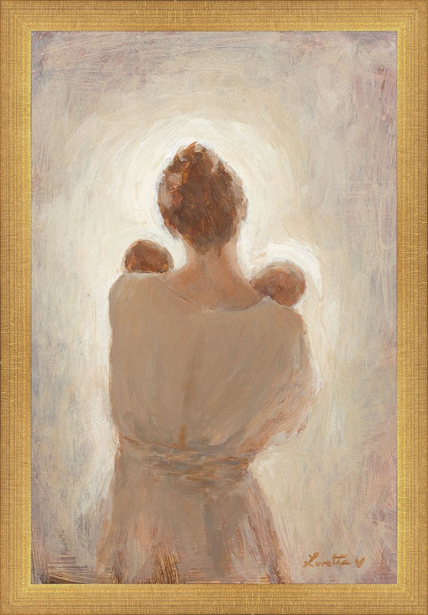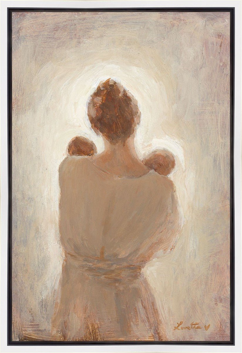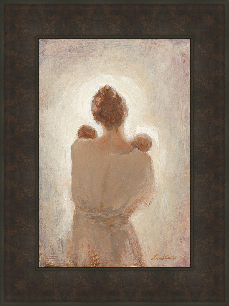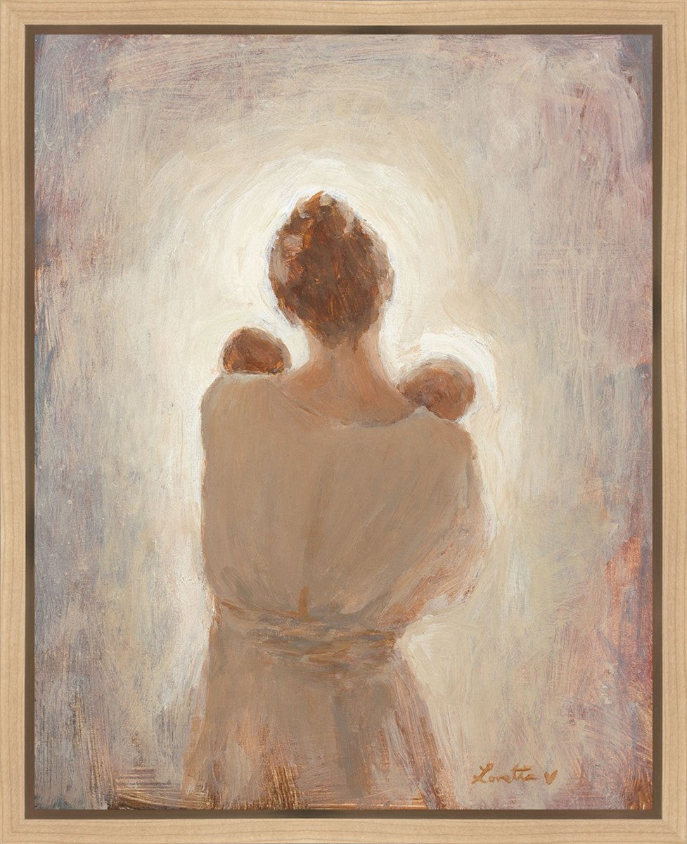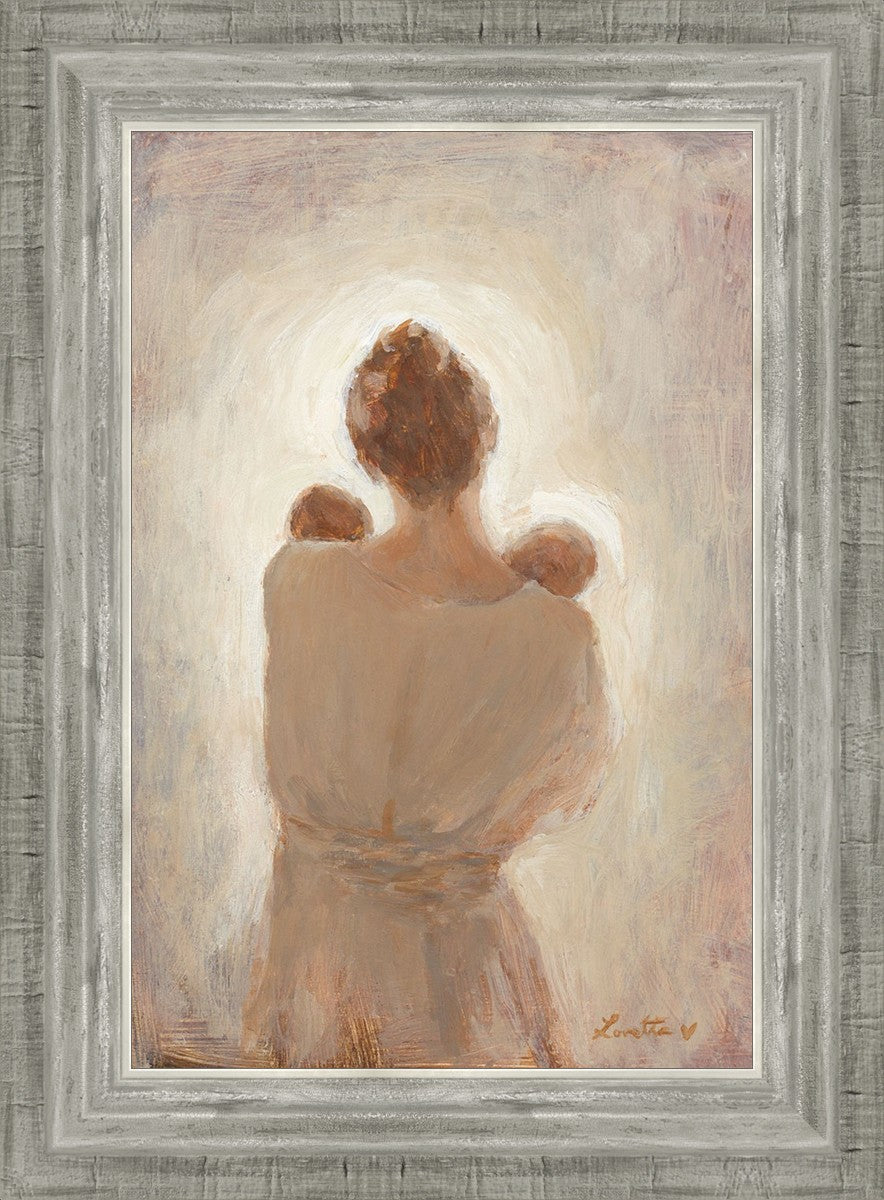 Two Little Loves" by Lovetta Reyes Cairo is a heartwarming painting portraying a mother holding her newborn twins against a soft pink background. This captivating artwork captures the beauty of motherhood and the bond between parent and child, making it perfect for nurseries and spaces celebrating the joy of new life. Immerse yourself in the tender embrace depicted in this artwork, ideal for those seeking inspiration and comfort in the journey of parenthood.
