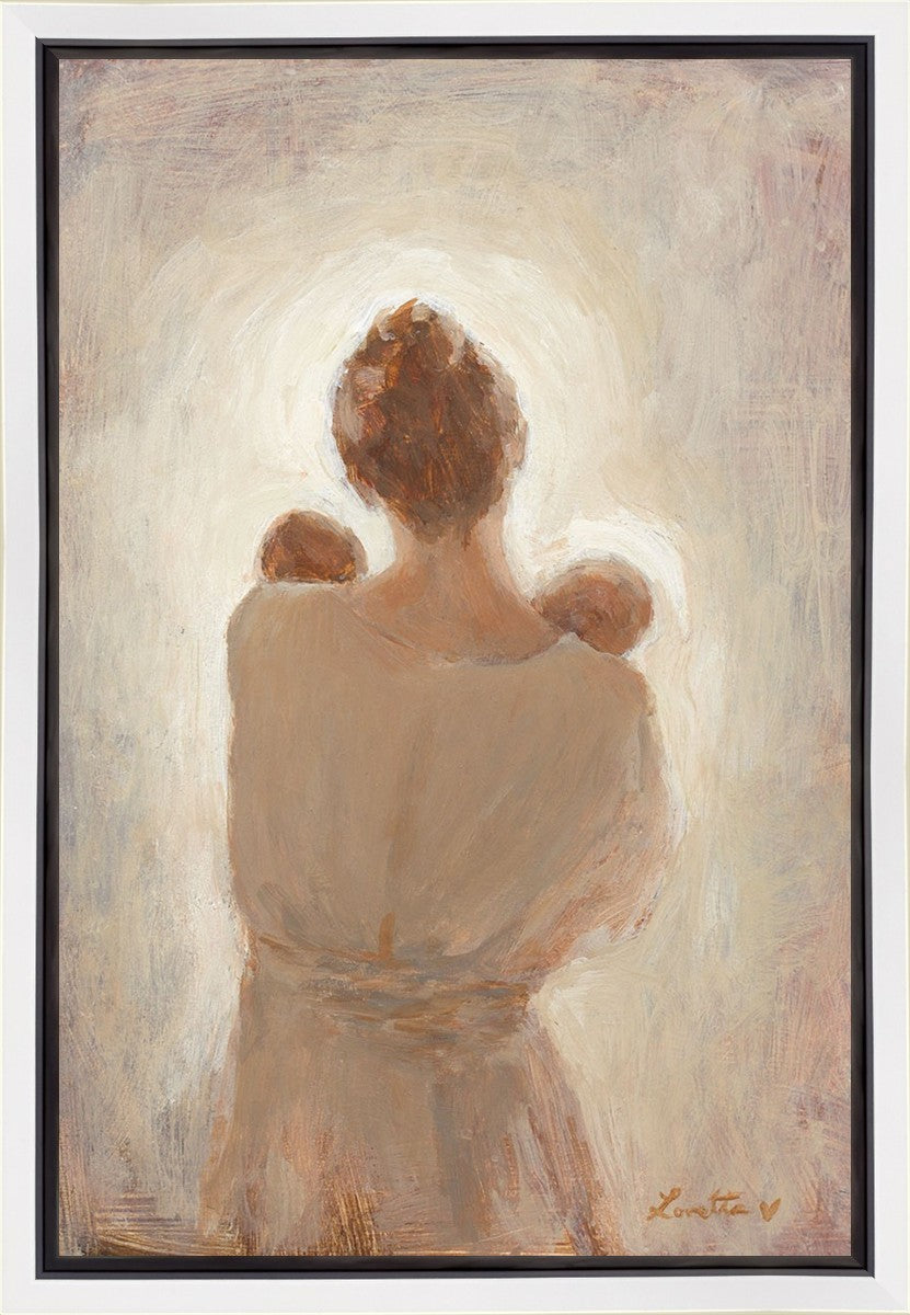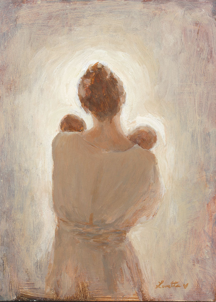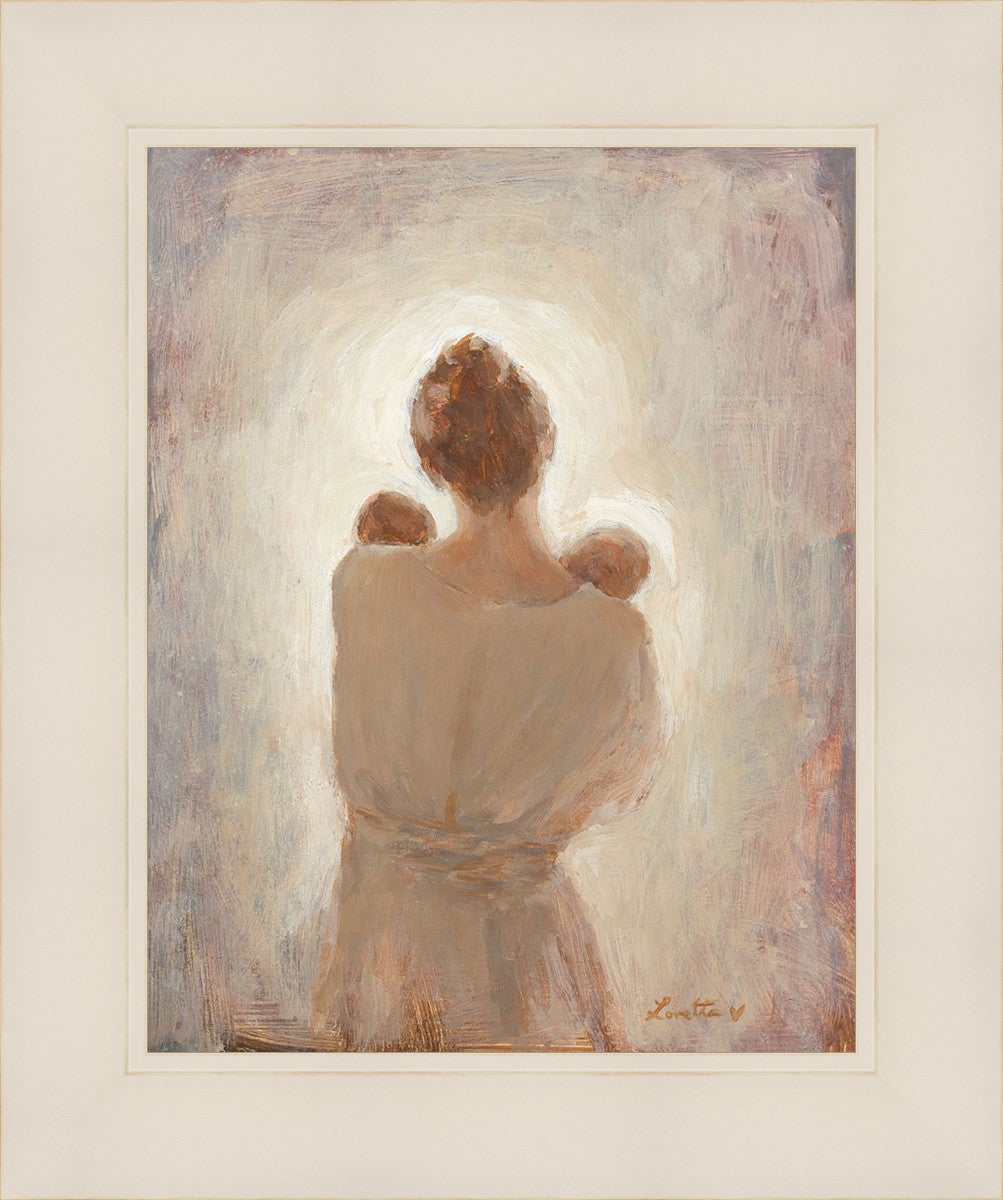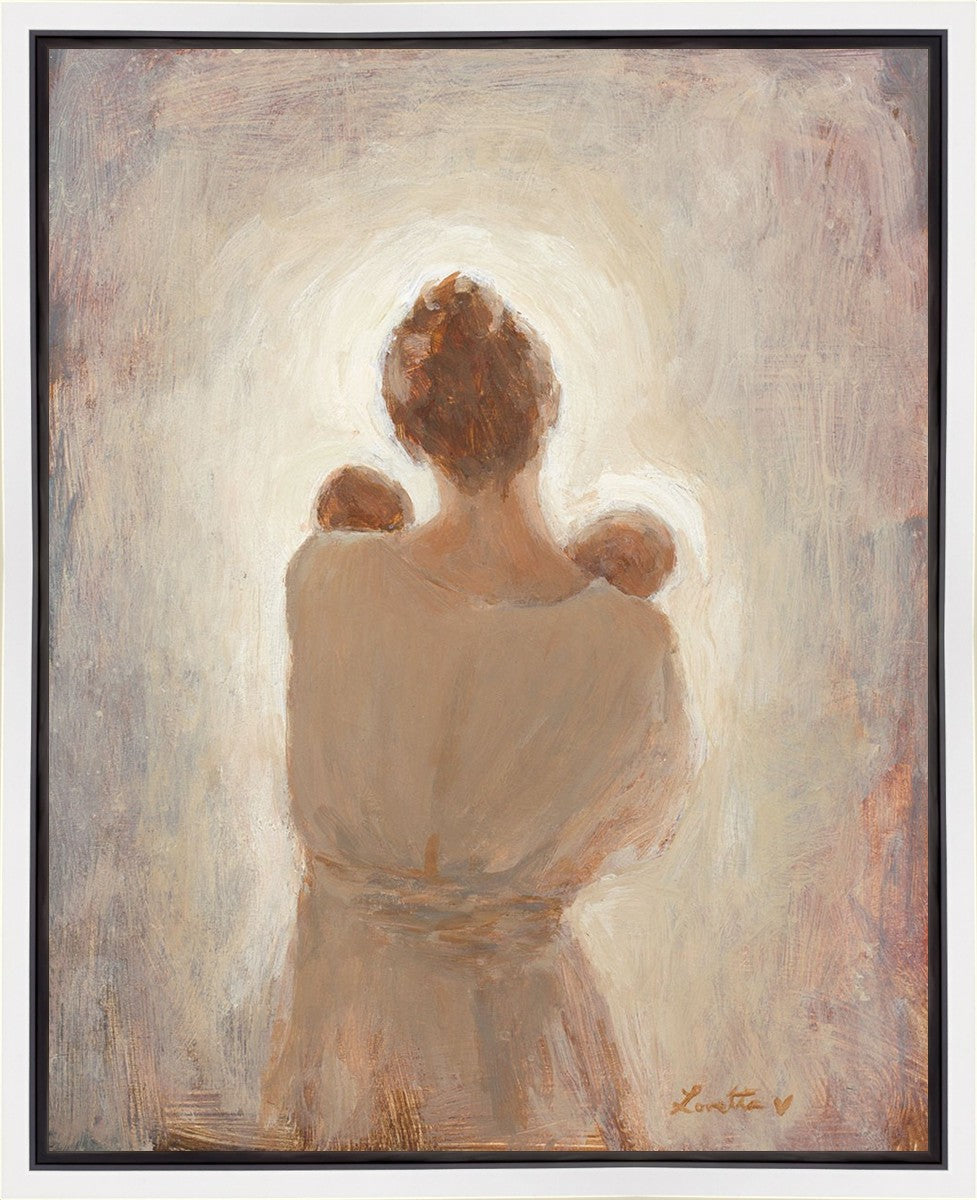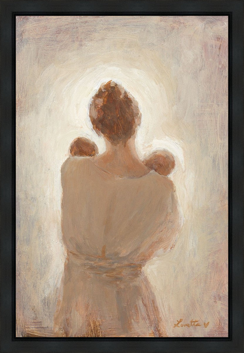 Two Little Loves" by Lovetta Reyes Cairo is a heartwarming painting portraying a mother holding her newborn twins against a soft pink background. This captivating artwork captures the beauty of motherhood and the bond between parent and child, making it perfect for nurseries and spaces celebrating the joy of new life. Immerse yourself in the tender embrace depicted in this artwork, ideal for those seeking inspiration and comfort in the journey of parenthood.