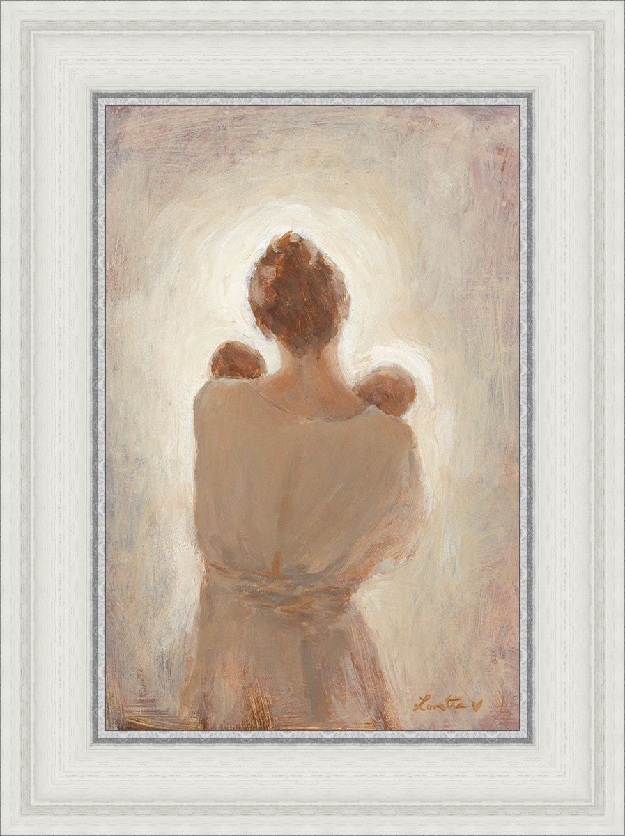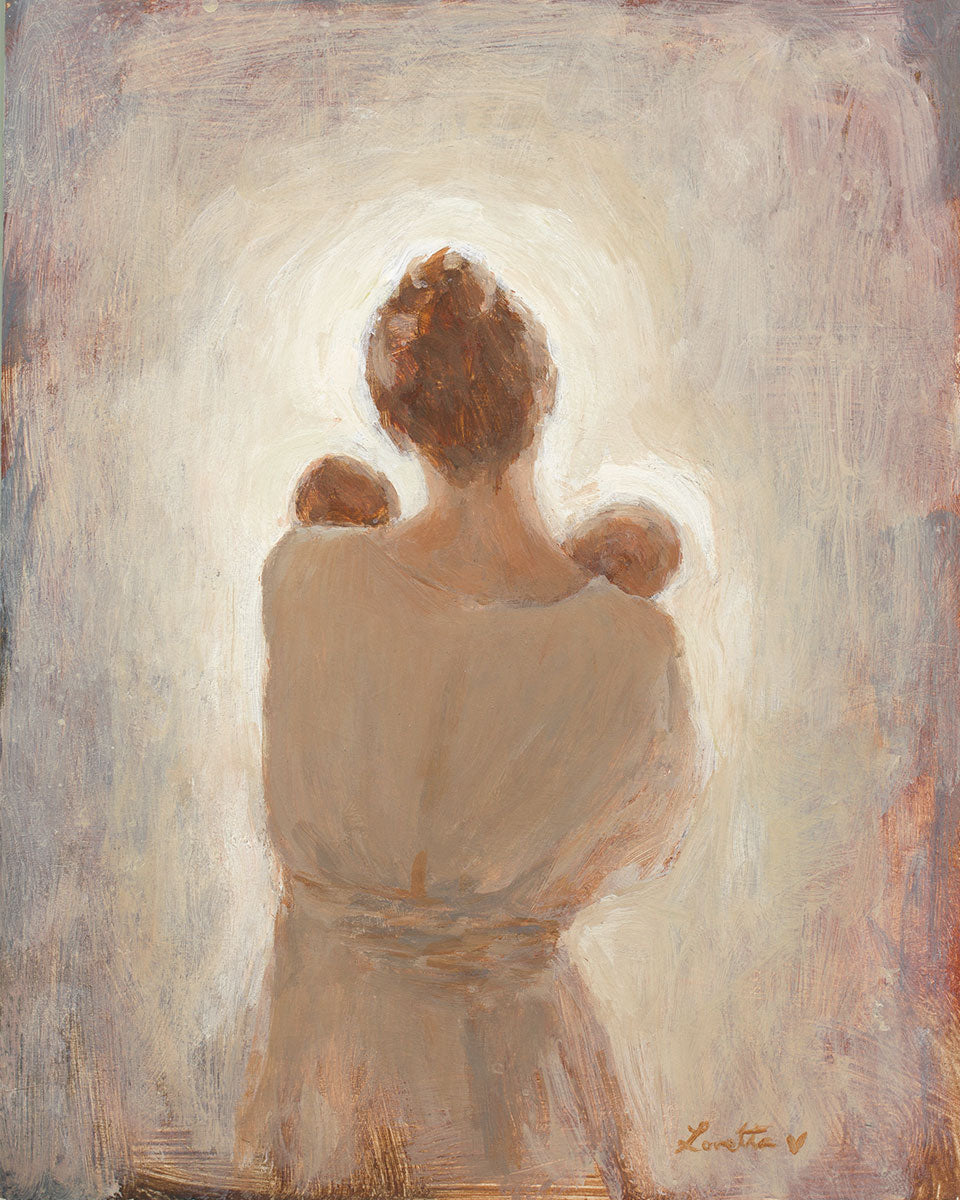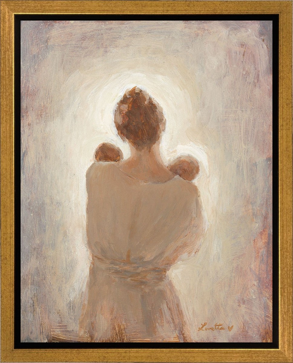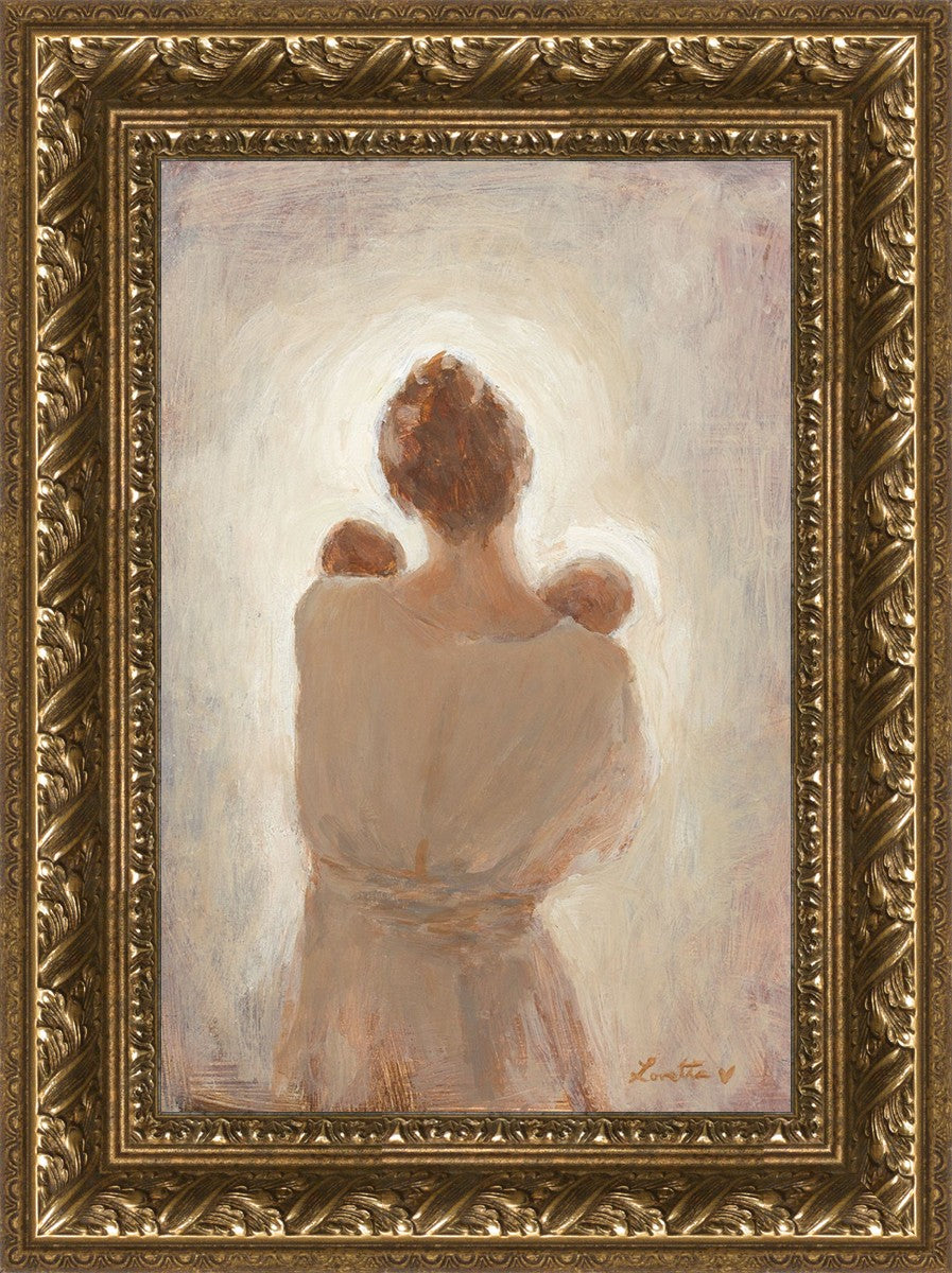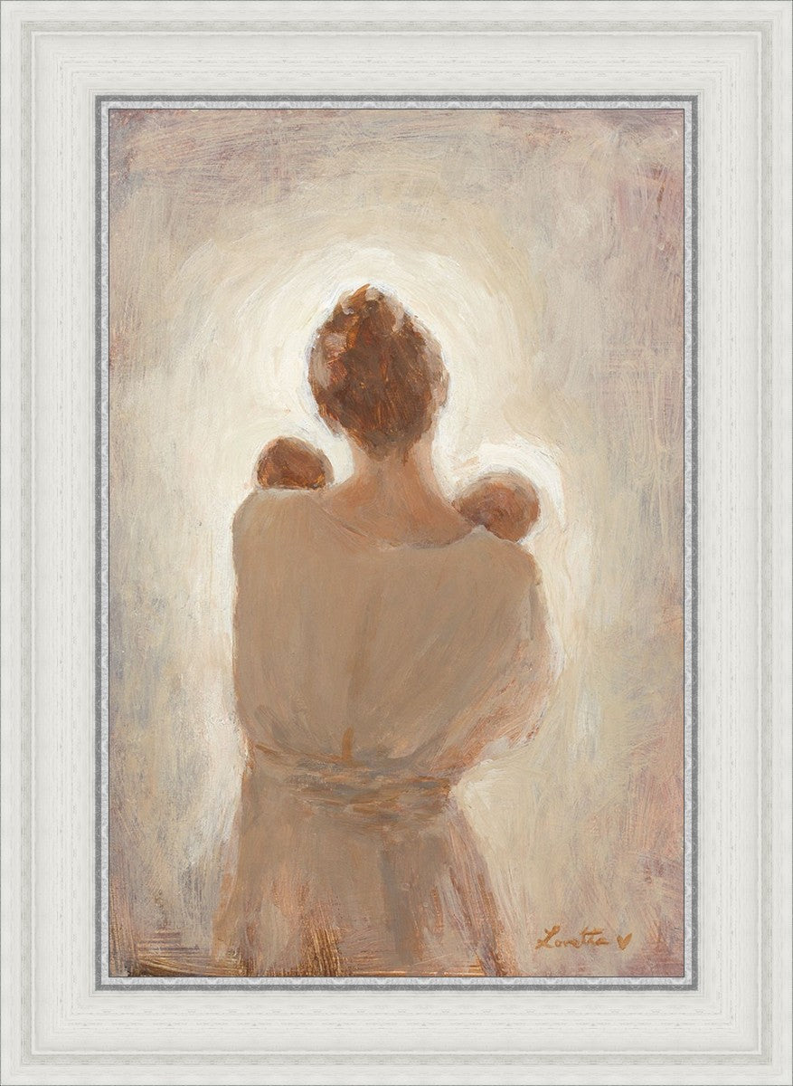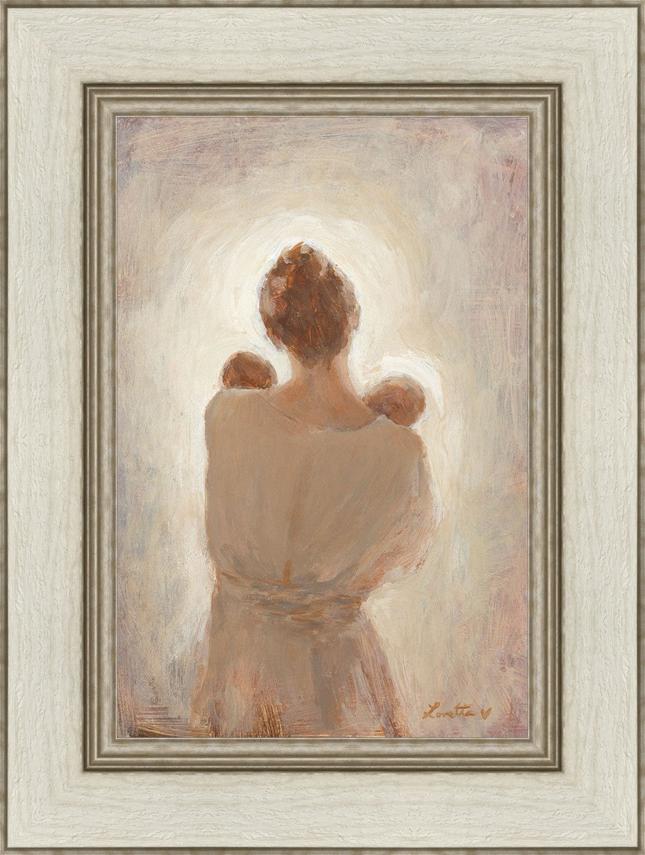 Two Little Loves" by Lovetta Reyes Cairo is a heartwarming painting portraying a mother holding her newborn twins against a soft pink background. This captivating artwork captures the beauty of motherhood and the bond between parent and child, making it perfect for nurseries and spaces celebrating the joy of new life. Immerse yourself in the tender embrace depicted in this artwork, ideal for those seeking inspiration and comfort in the journey of parenthood.