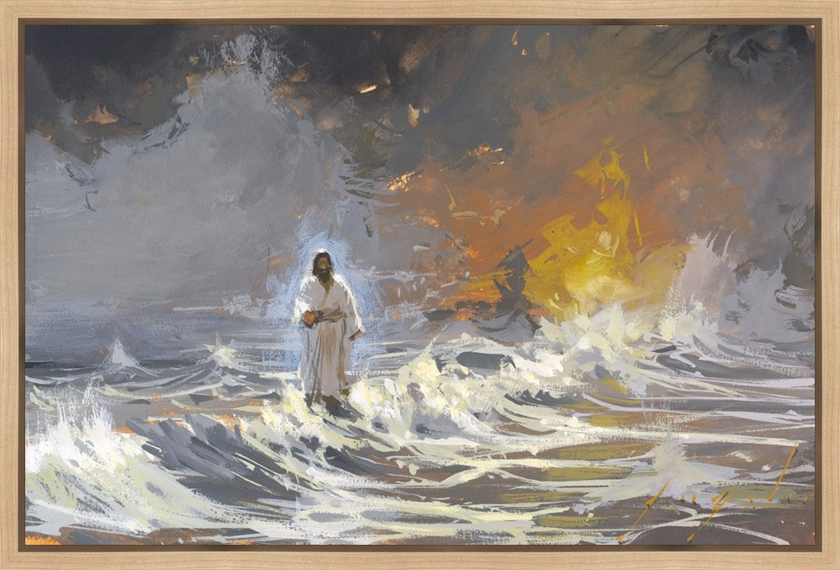 This is the moment when Christ is approaching his disciples on the stormy waters. This was a painting that I wanted to do but could not visualize it in my mind on how to approach it. I kept seeing a beautiful sunset and that just didn't feel right. I put that idea on hold for a while. When I came back to it, I started thinking more about the water itself and what that might look like. Then it all came together, once I could see the tumultuous waters and a wave crashing through as Jesus was walking peacefully on the waters amongst the storms, the paint was finished in record time.