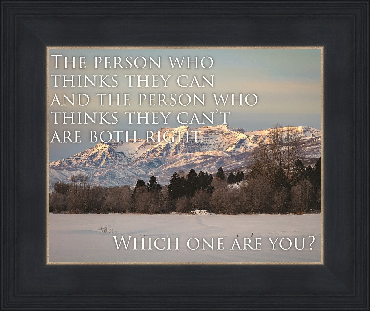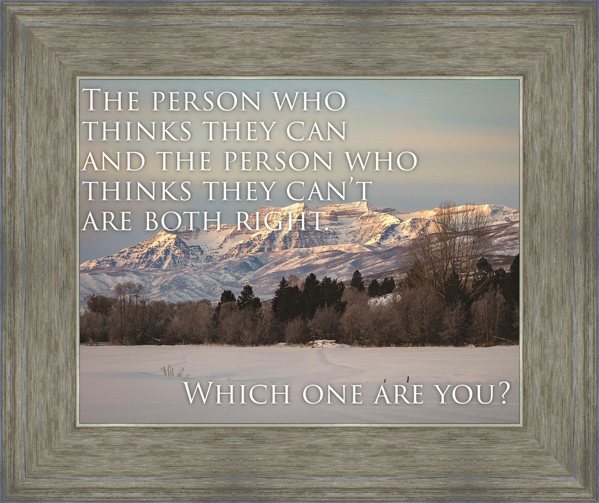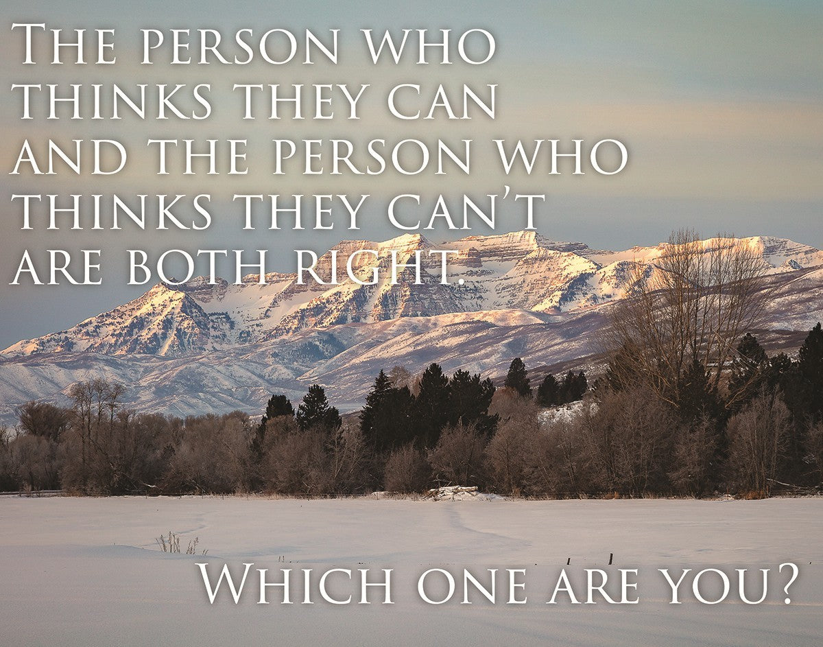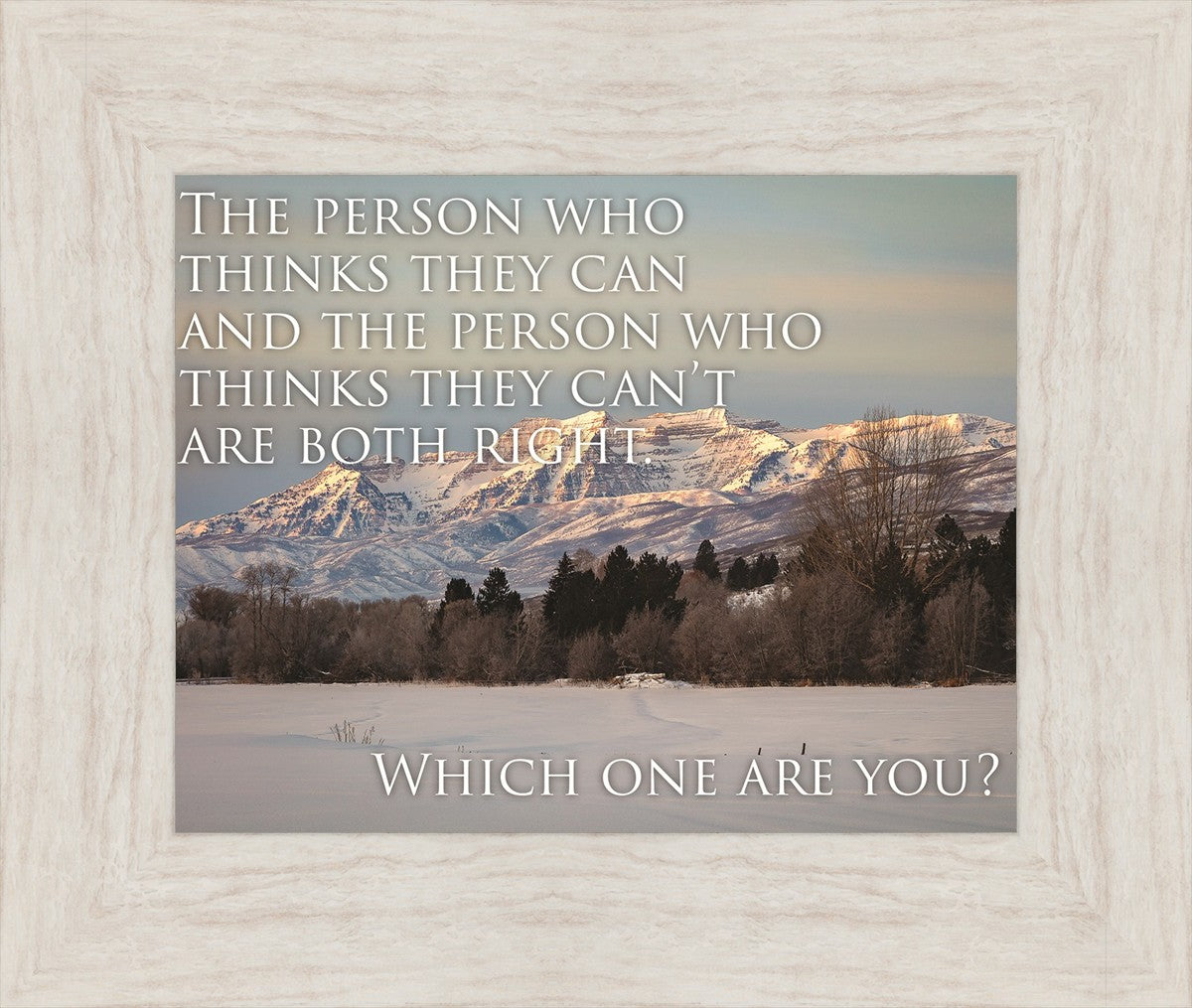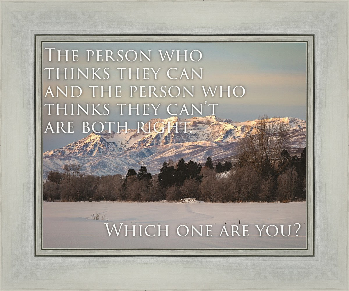 Who Thinks They Can Motivisional Poster by Julie Kerr features a photograph of sunrise on a snowcapped Mount Timpanogos with an inspirational quote , "the person who thinks they can and the person who thinks they can't are both right. Which one are you?"