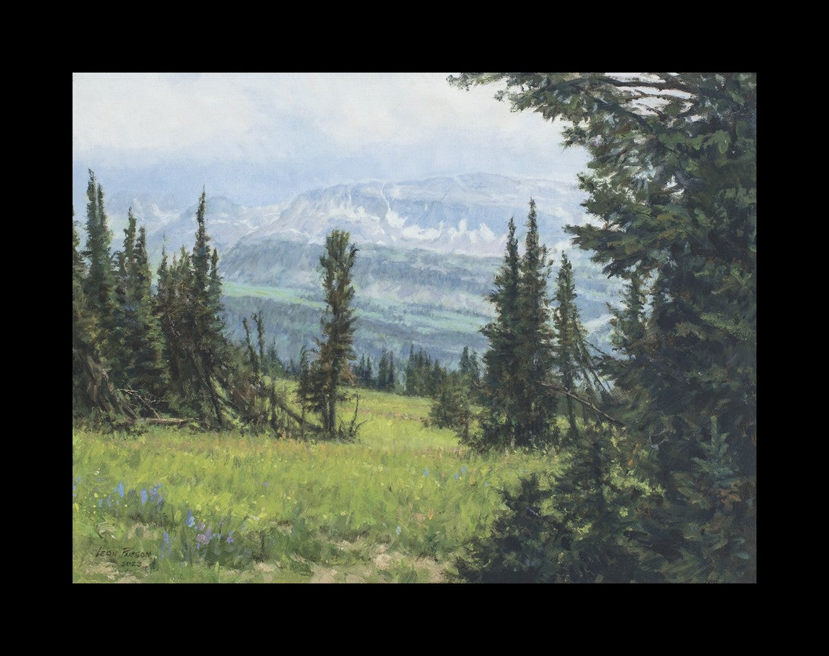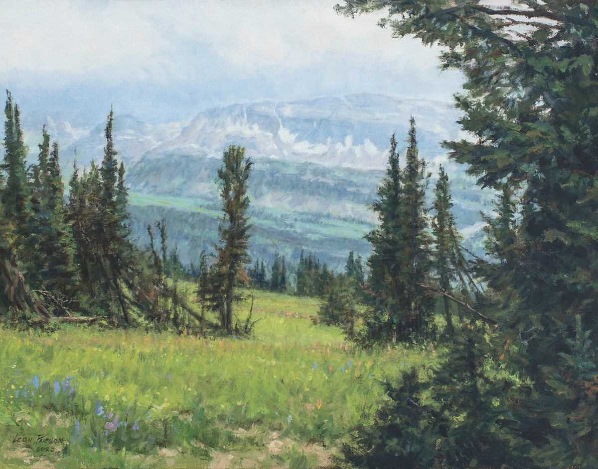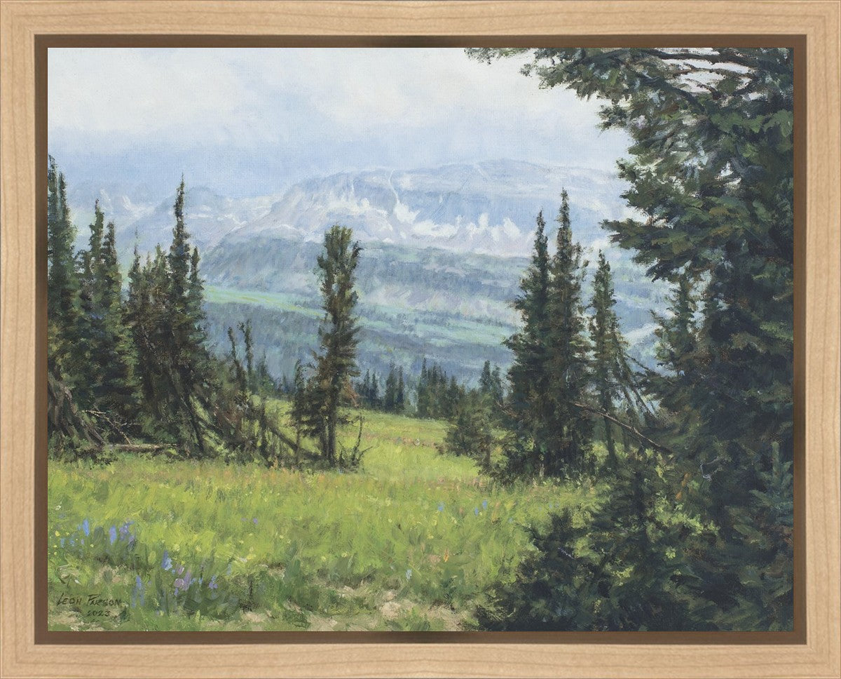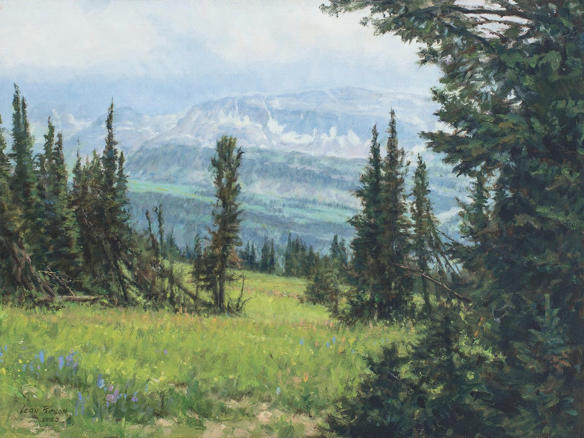The location for this painting is from a hike up to Table Rock, near the Grand Teton Peak, when I was serving as a leader to a group of young men and young women. I enjoyed the obvious evidence of the severity of the windstorms that are ever present that high up but also loved the wonderful resilience of the stand of pines. It started as a BYUI Landscape class demo but deserved a good amount of additional studio time later.