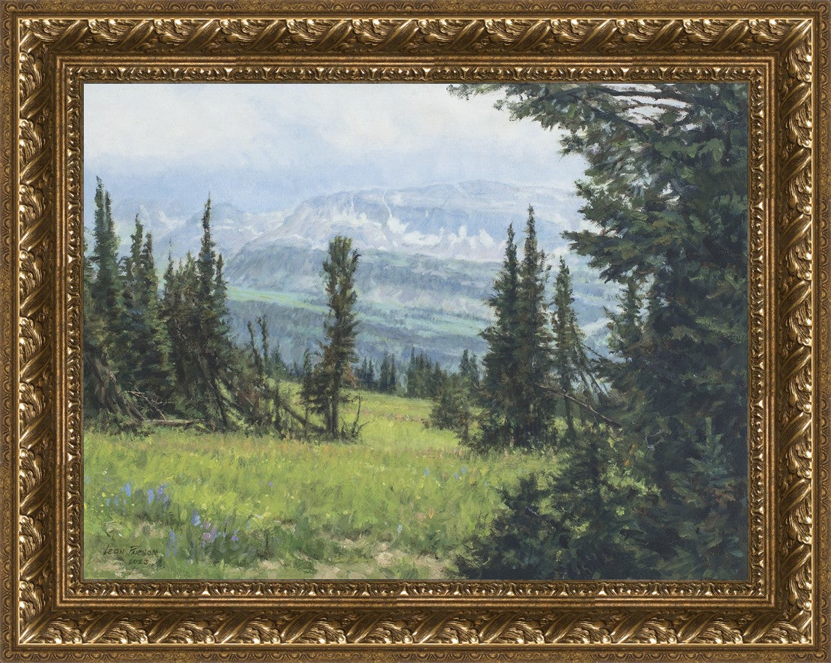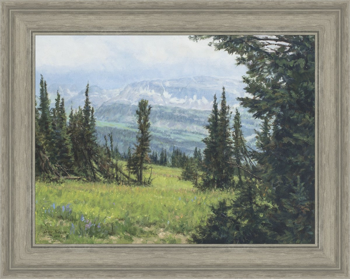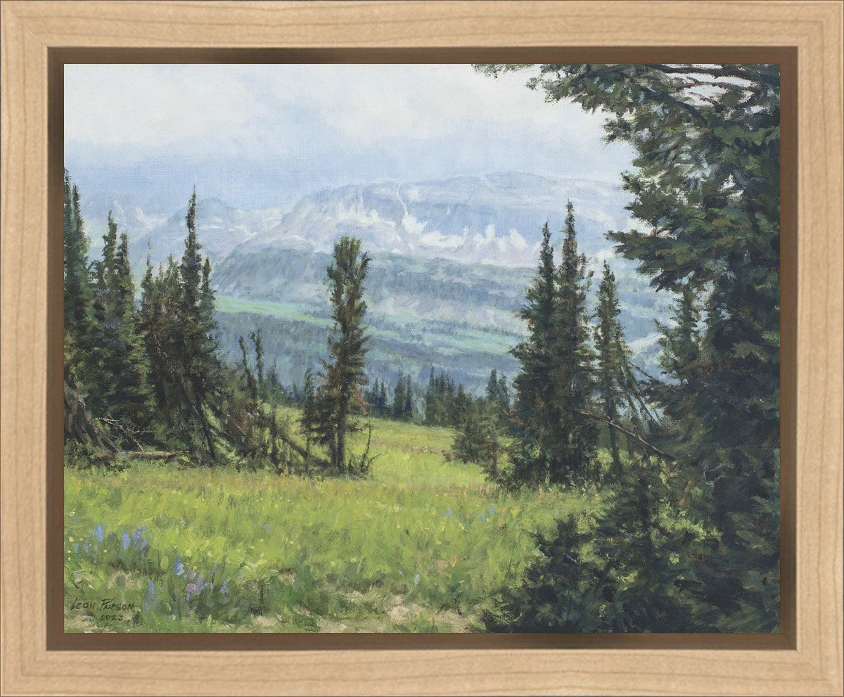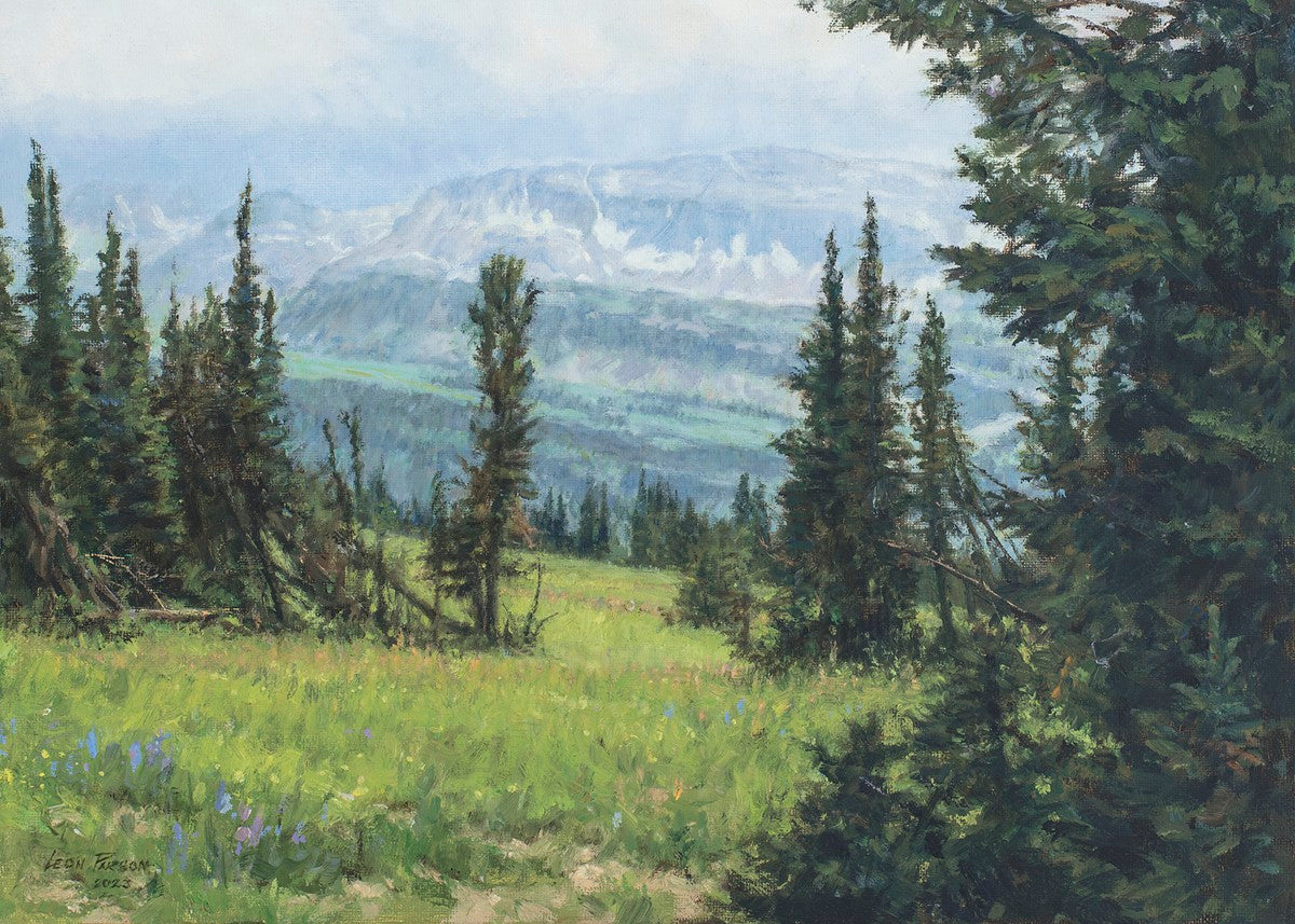 The location for this painting is from a hike up to Table Rock, near the Grand Teton Peak, when I was serving as a leader to a group of young men and young women. I enjoyed the obvious evidence of the severity of the windstorms that are ever present that high up but also loved the wonderful resilience of the stand of pines. It started as a BYUI Landscape class demo but deserved a good amount of additional studio time later.