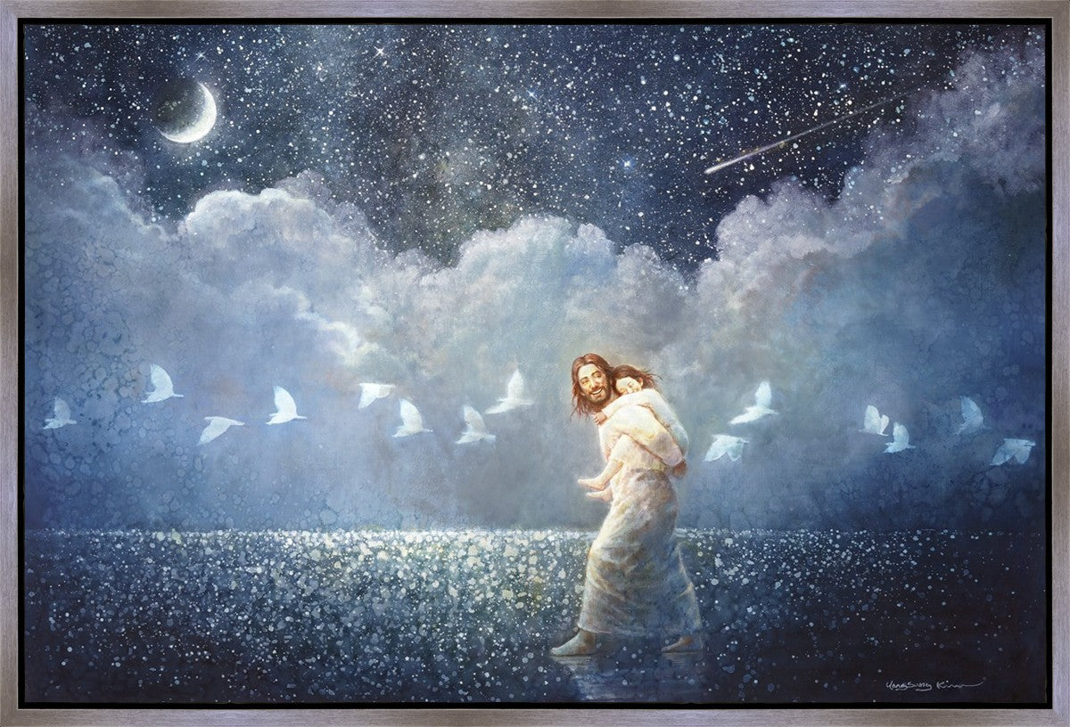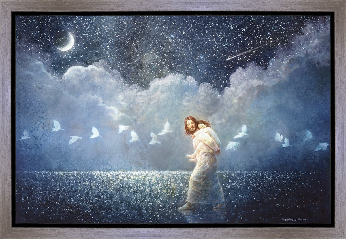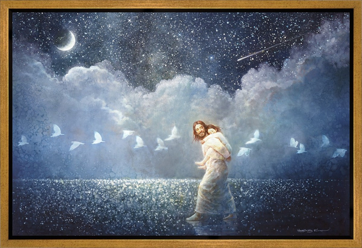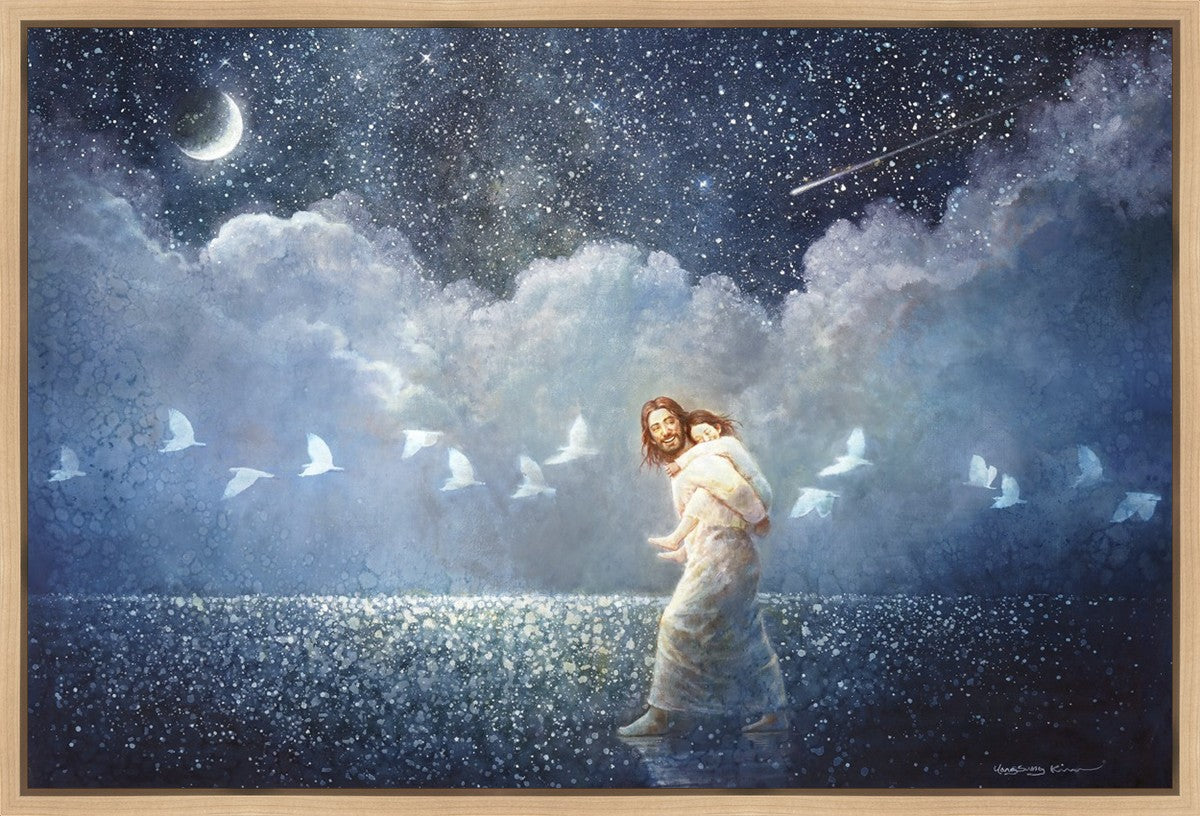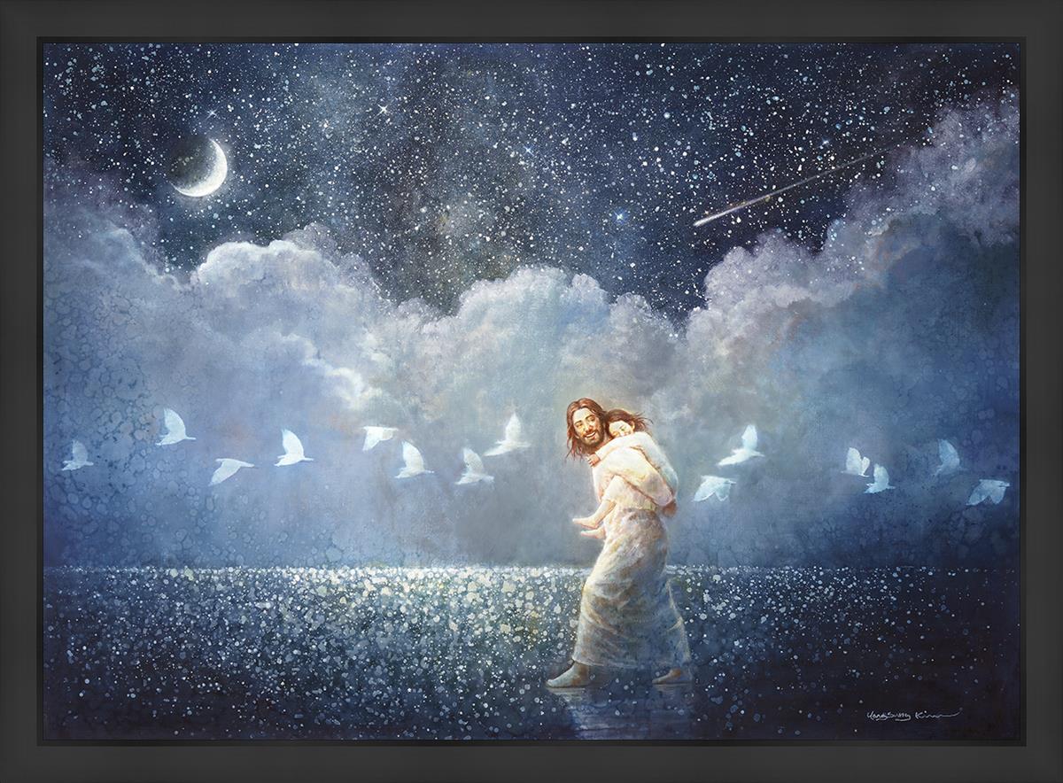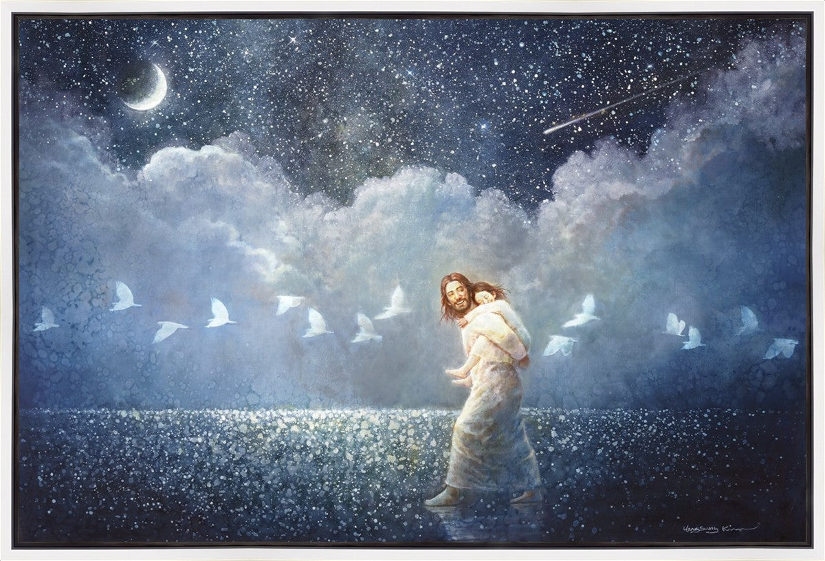"With All Thy Heart" by Yongsung Kim is a captivating painting featuring Jesus Christ carrying a young girl over water in a dreamlike landscape. This masterpiece showcases celestial elements like the moon, stars, and a comet in the background. Perfect for art enthusiasts seeking spiritual inspiration and tranquility. Purchase this stunning artwork to adorn your space with timeless beauty and divine symbolism. Ideal for home decor, religious spaces, or as a thoughtful gift for loved ones.