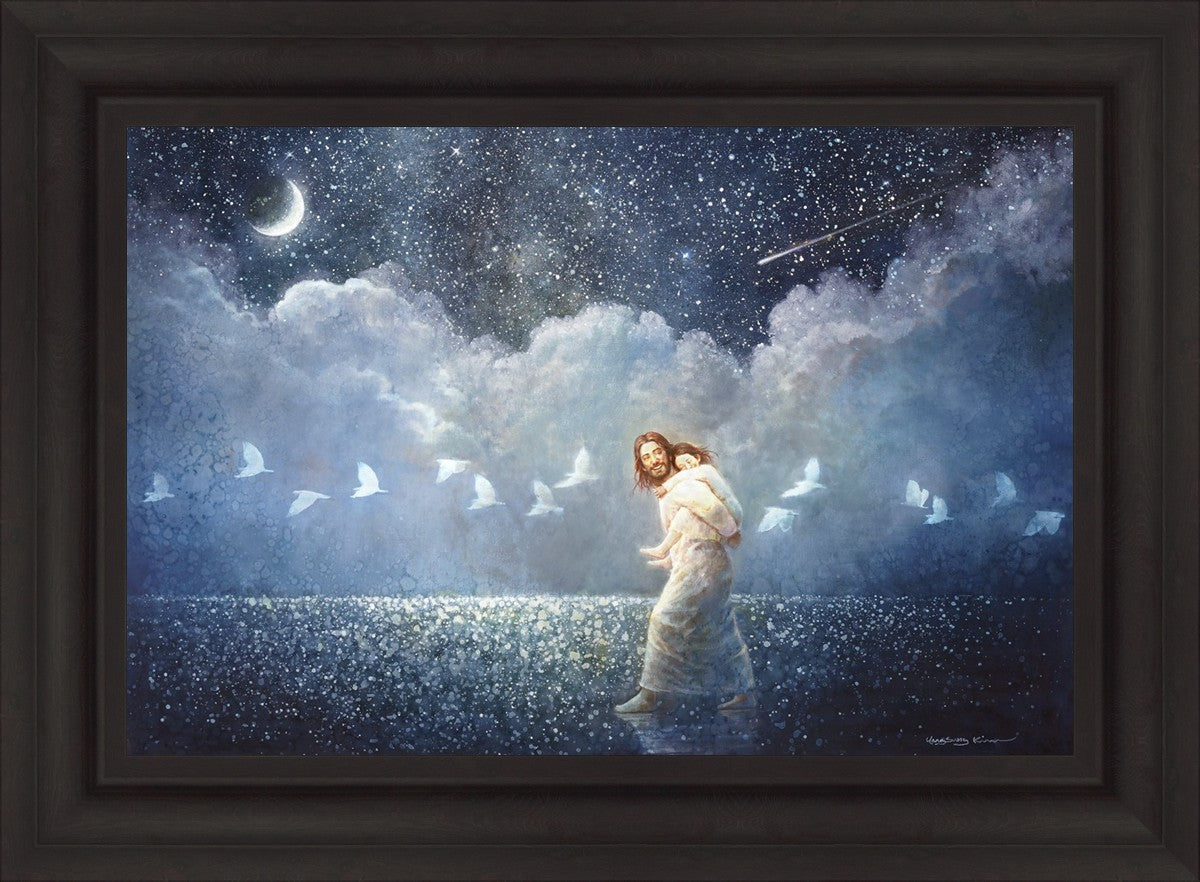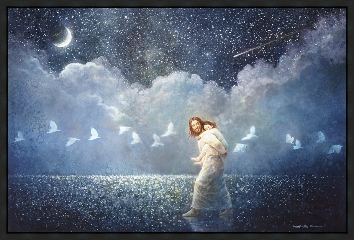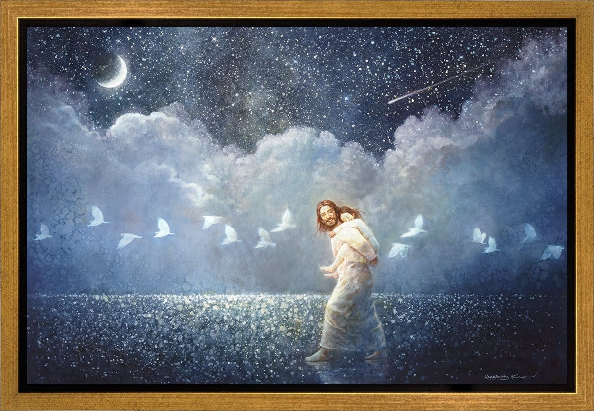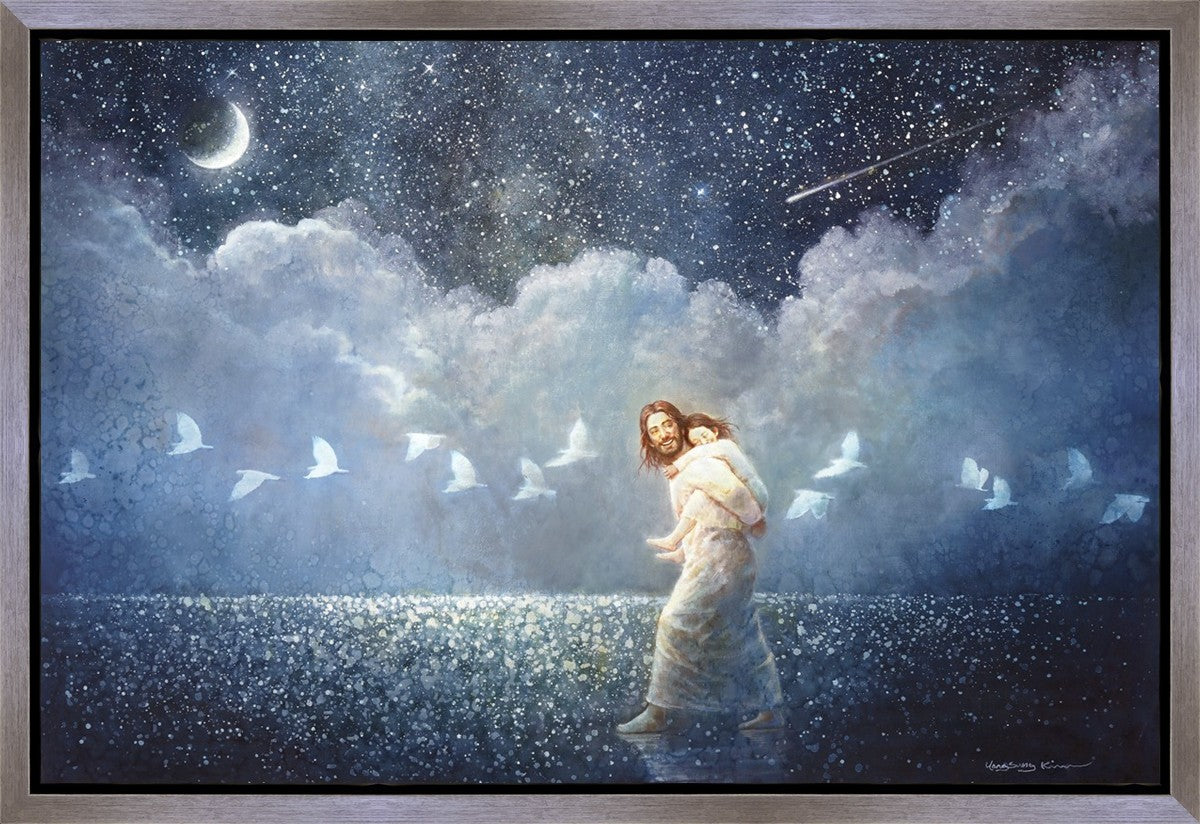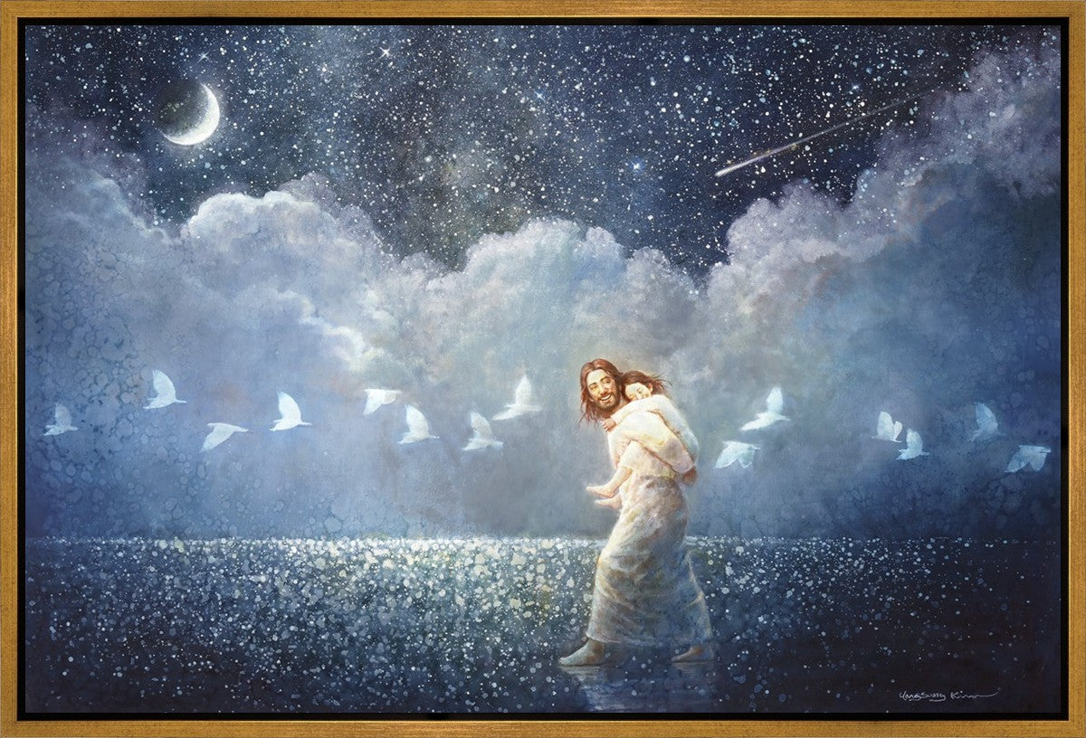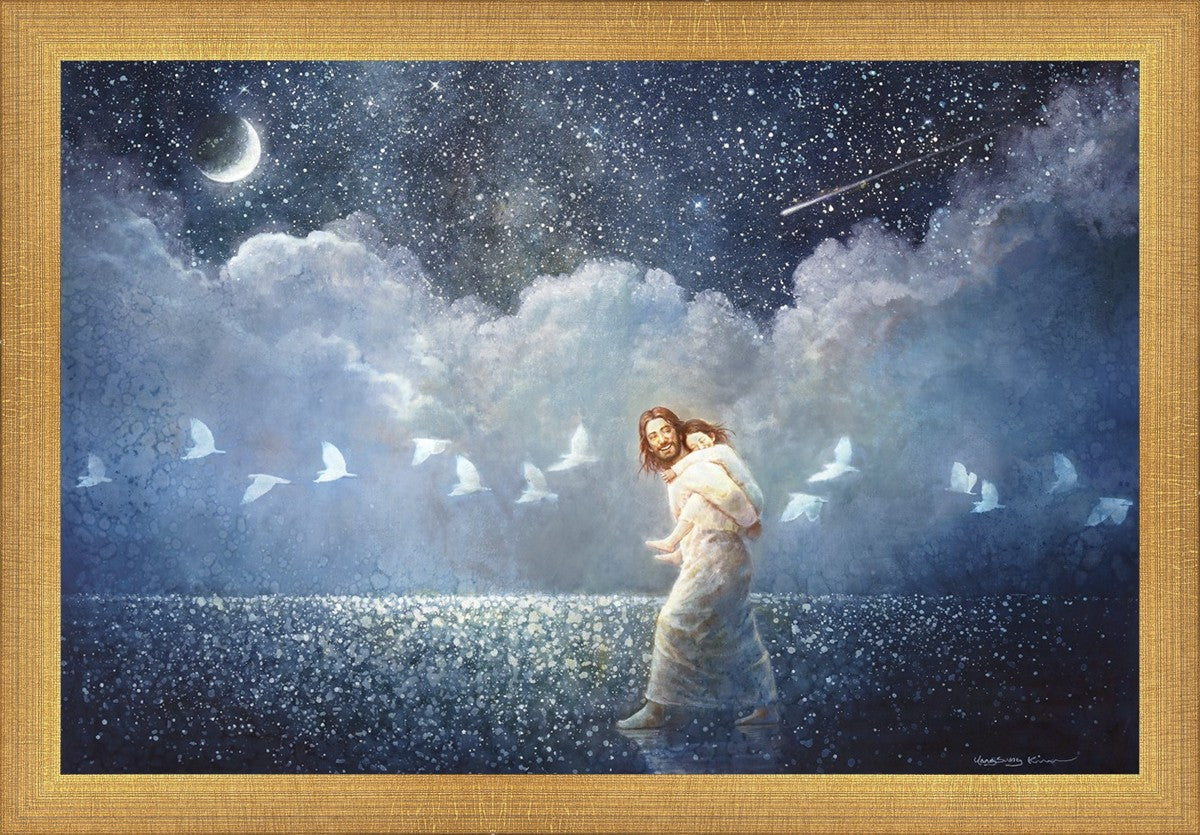 "With All Thy Heart" by Yongsung Kim is a captivating painting featuring Jesus Christ carrying a young girl over water in a dreamlike landscape. This masterpiece showcases celestial elements like the moon, stars, and a comet in the background. Perfect for art enthusiasts seeking spiritual inspiration and tranquility. Purchase this stunning artwork to adorn your space with timeless beauty and divine symbolism. Ideal for home decor, religious spaces, or as a thoughtful gift for loved ones.