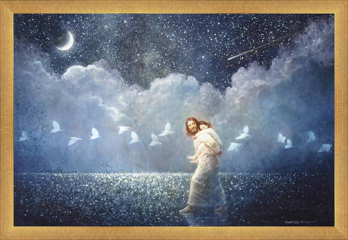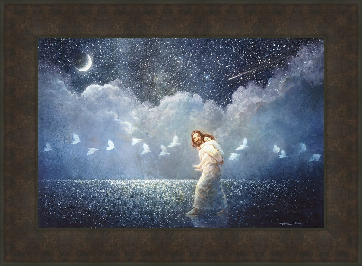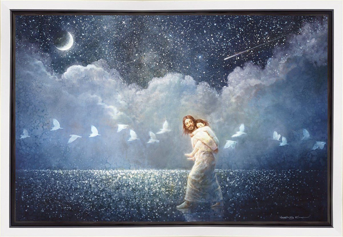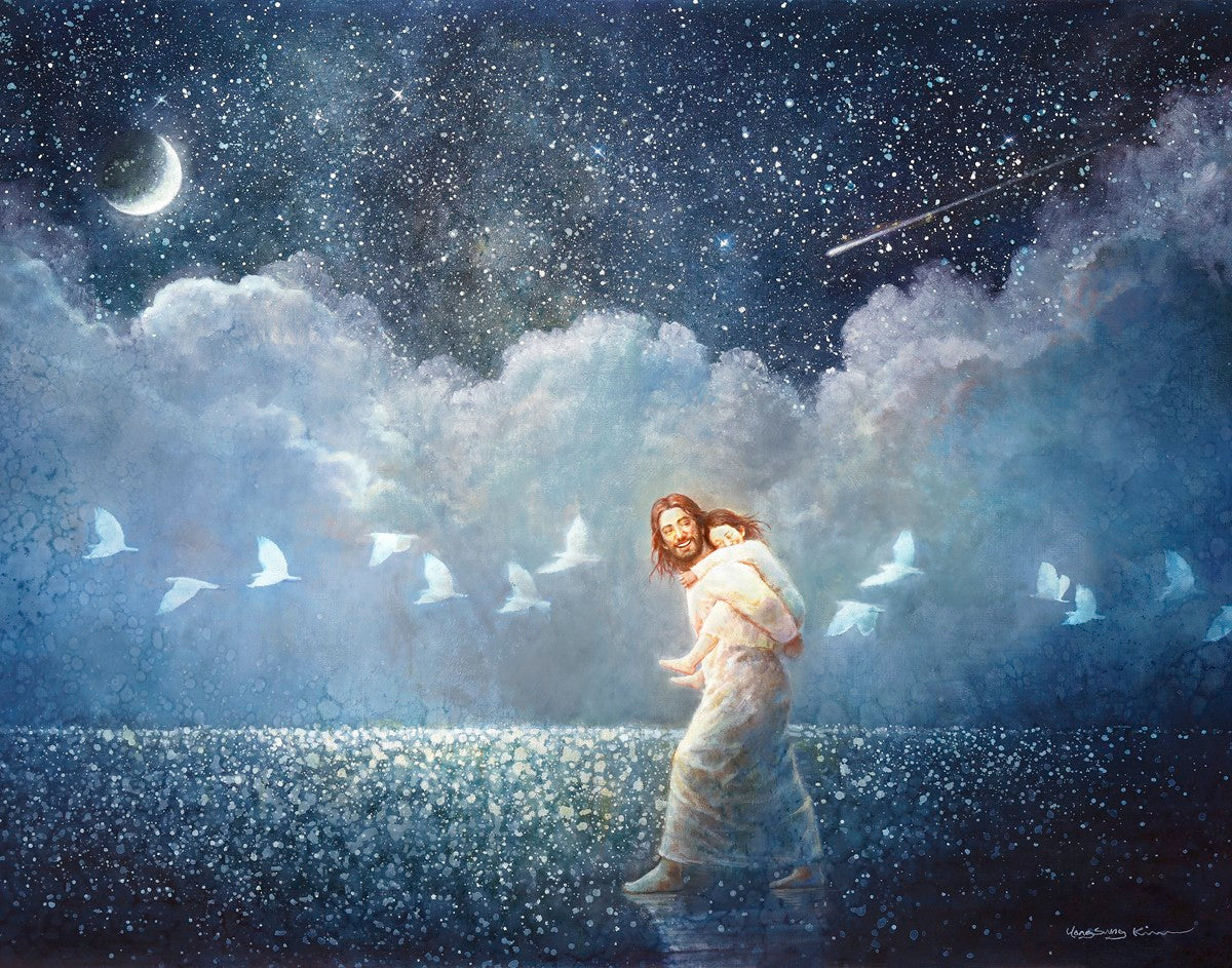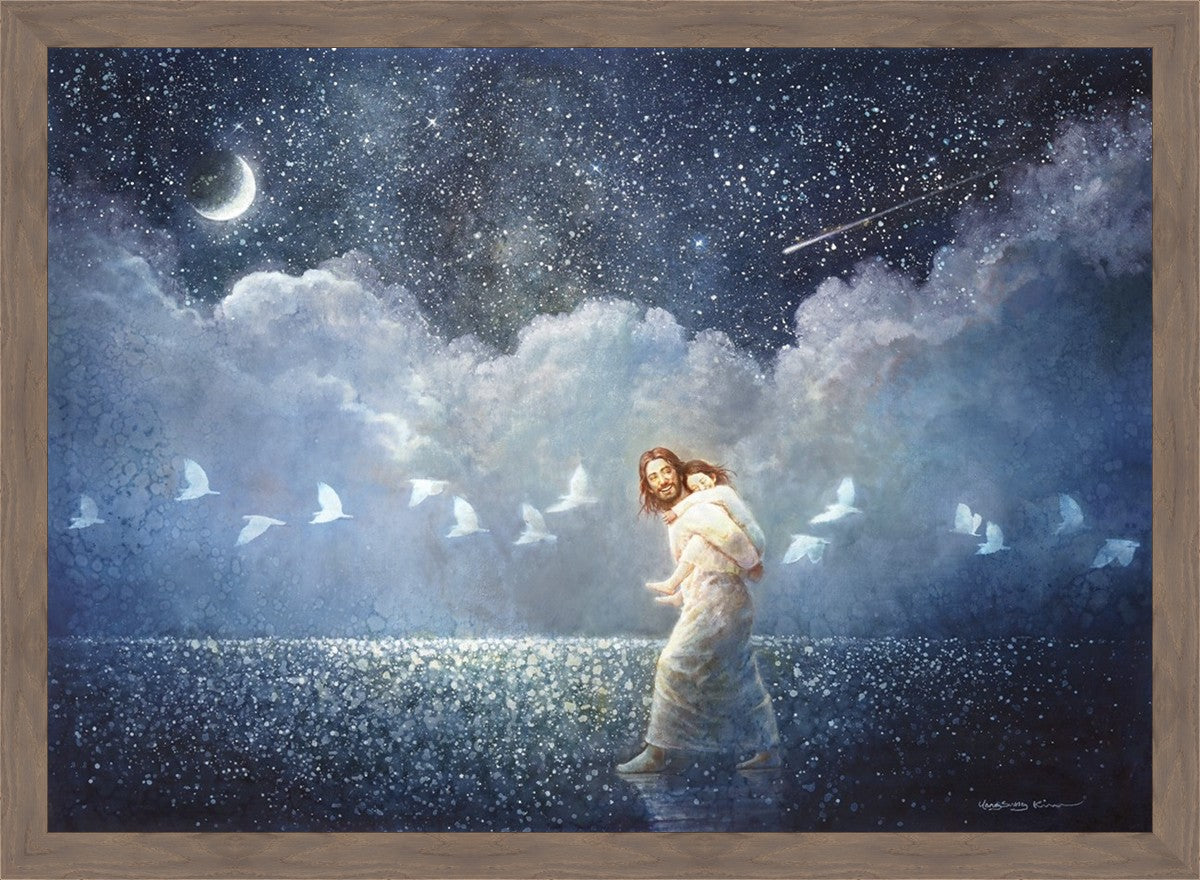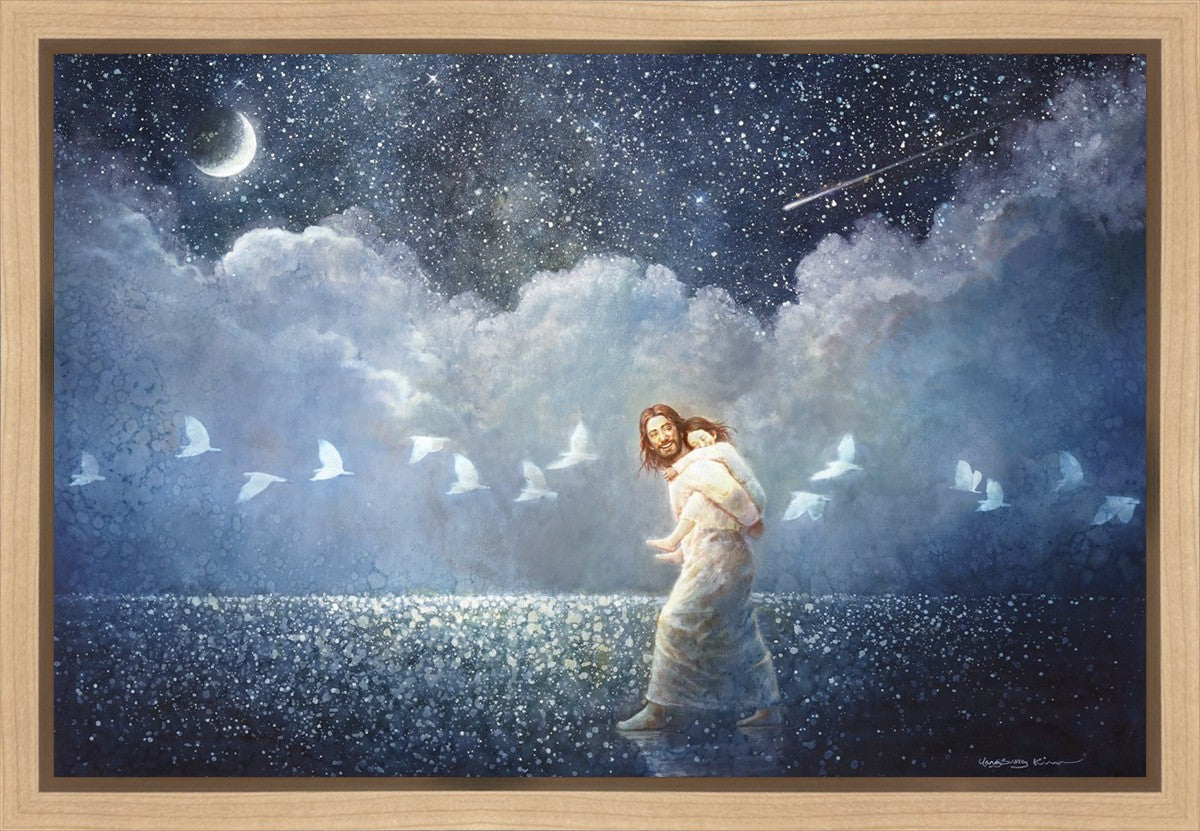 "With All Thy Heart" by Yongsung Kim is a captivating painting featuring Jesus Christ carrying a young girl over water in a dreamlike landscape. This masterpiece showcases celestial elements like the moon, stars, and a comet in the background. Perfect for art enthusiasts seeking spiritual inspiration and tranquility. Purchase this stunning artwork to adorn your space with timeless beauty and divine symbolism. Ideal for home decor, religious spaces, or as a thoughtful gift for loved ones.