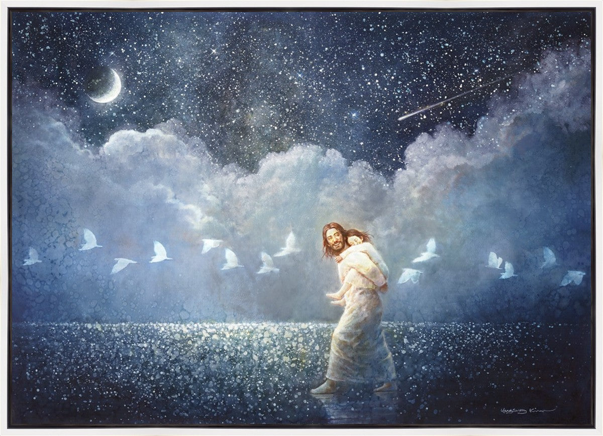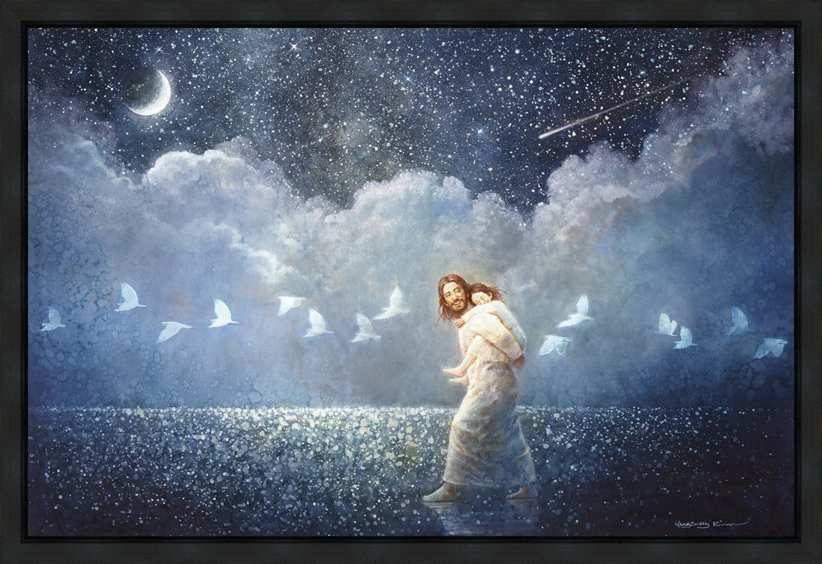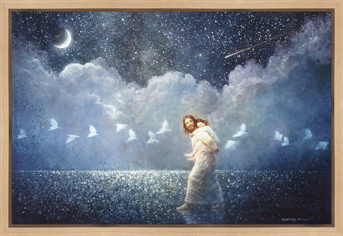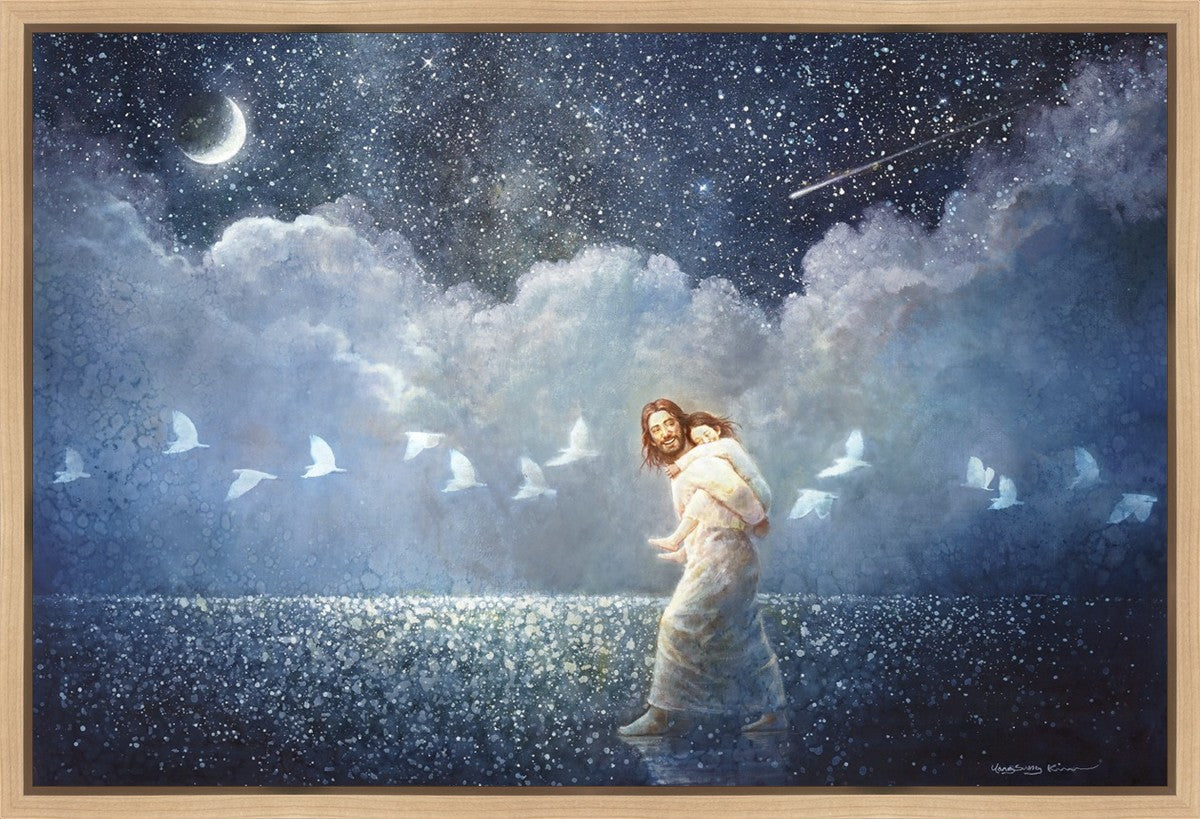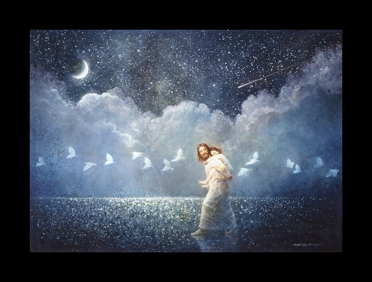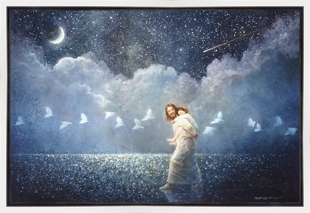 "With All Thy Heart" by Yongsung Kim is a captivating painting featuring Jesus Christ carrying a young girl over water in a dreamlike landscape. This masterpiece showcases celestial elements like the moon, stars, and a comet in the background. Perfect for art enthusiasts seeking spiritual inspiration and tranquility. Purchase this stunning artwork to adorn your space with timeless beauty and divine symbolism. Ideal for home decor, religious spaces, or as a thoughtful gift for loved ones.