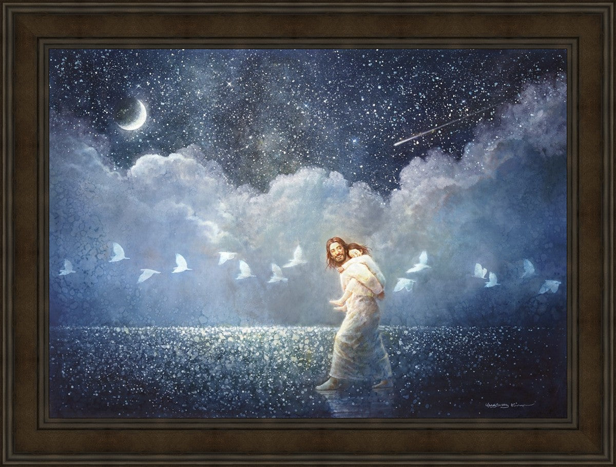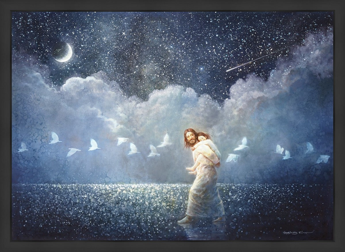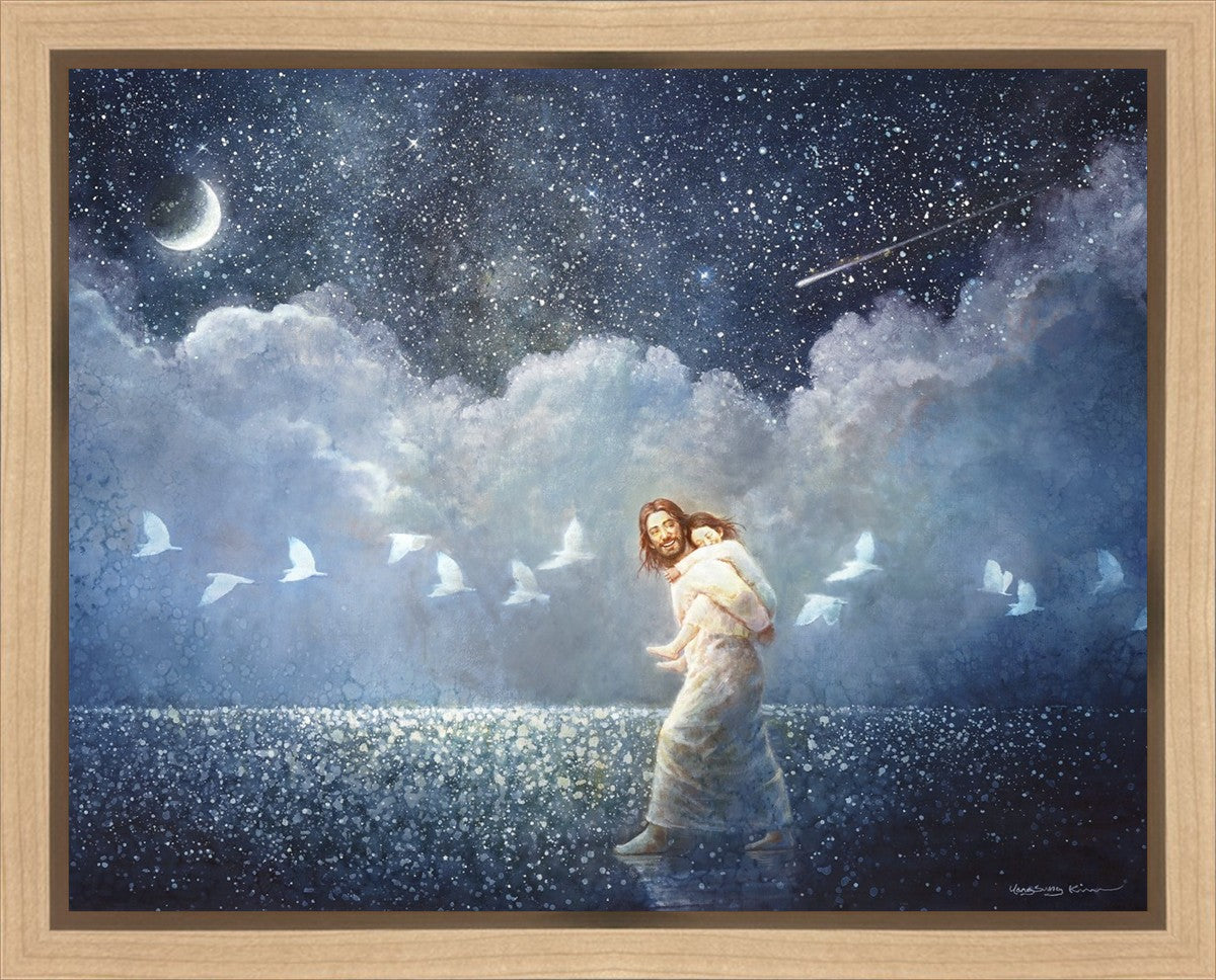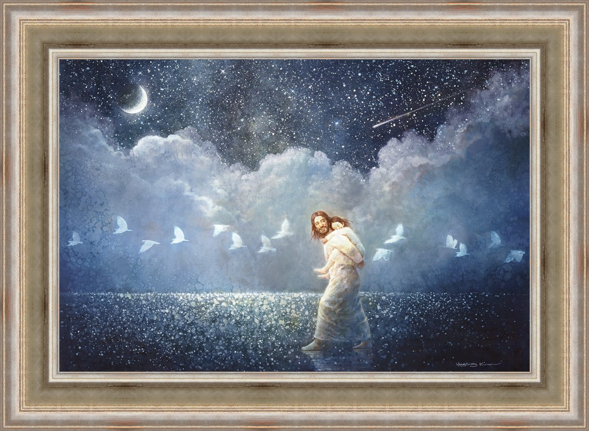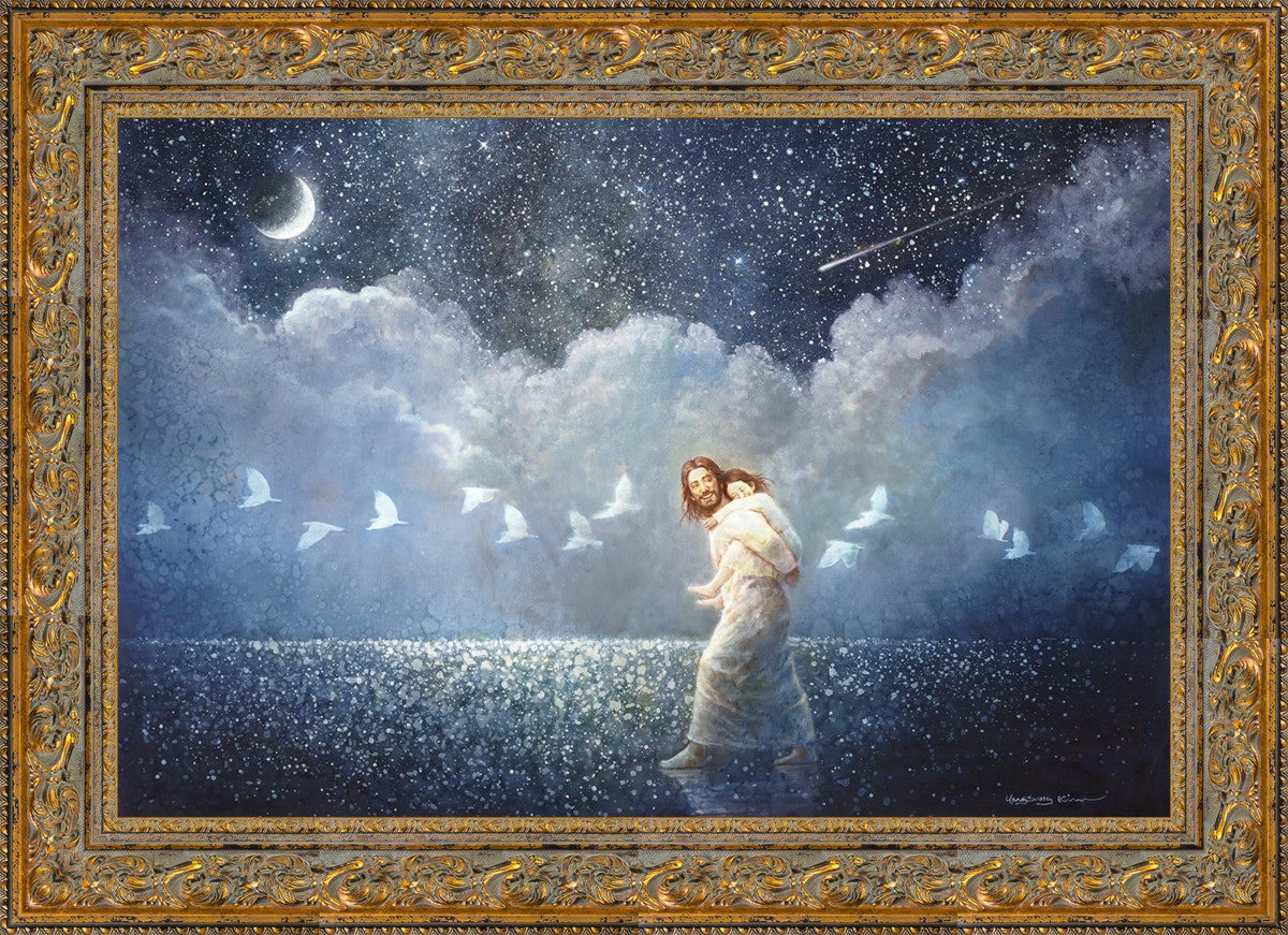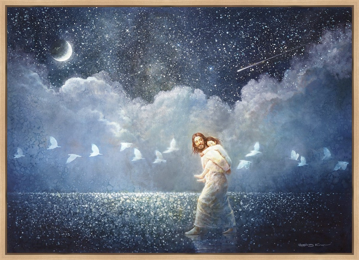"With All Thy Heart" by Yongsung Kim is a captivating painting featuring Jesus Christ carrying a young girl over water in a dreamlike landscape. This masterpiece showcases celestial elements like the moon, stars, and a comet in the background. Perfect for art enthusiasts seeking spiritual inspiration and tranquility. Purchase this stunning artwork to adorn your space with timeless beauty and divine symbolism. Ideal for home decor, religious spaces, or as a thoughtful gift for loved ones.