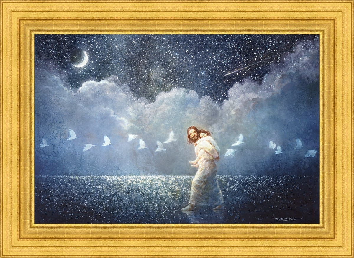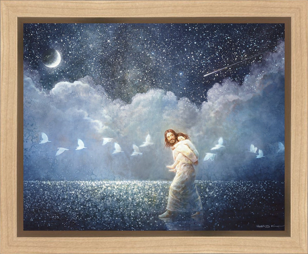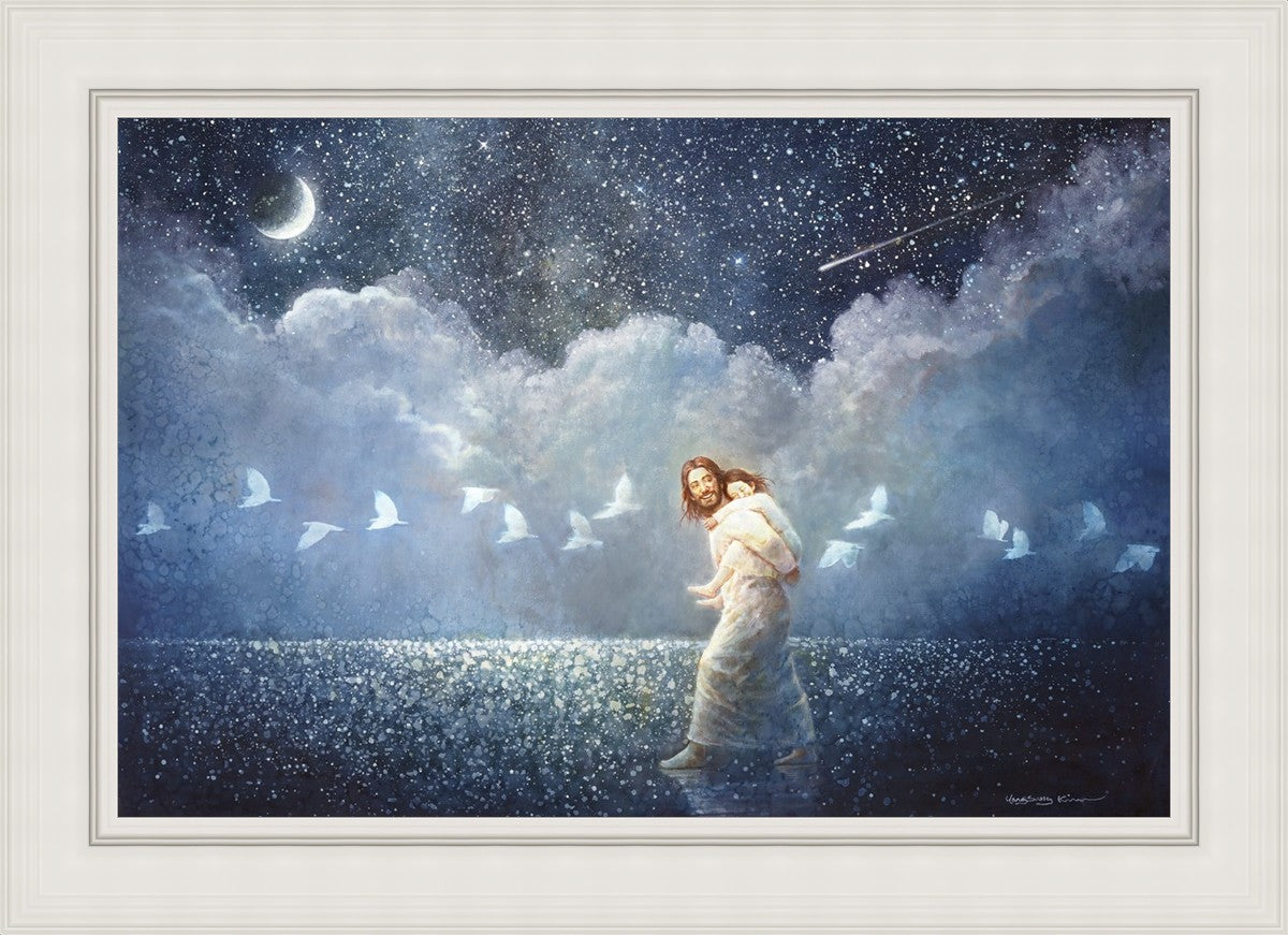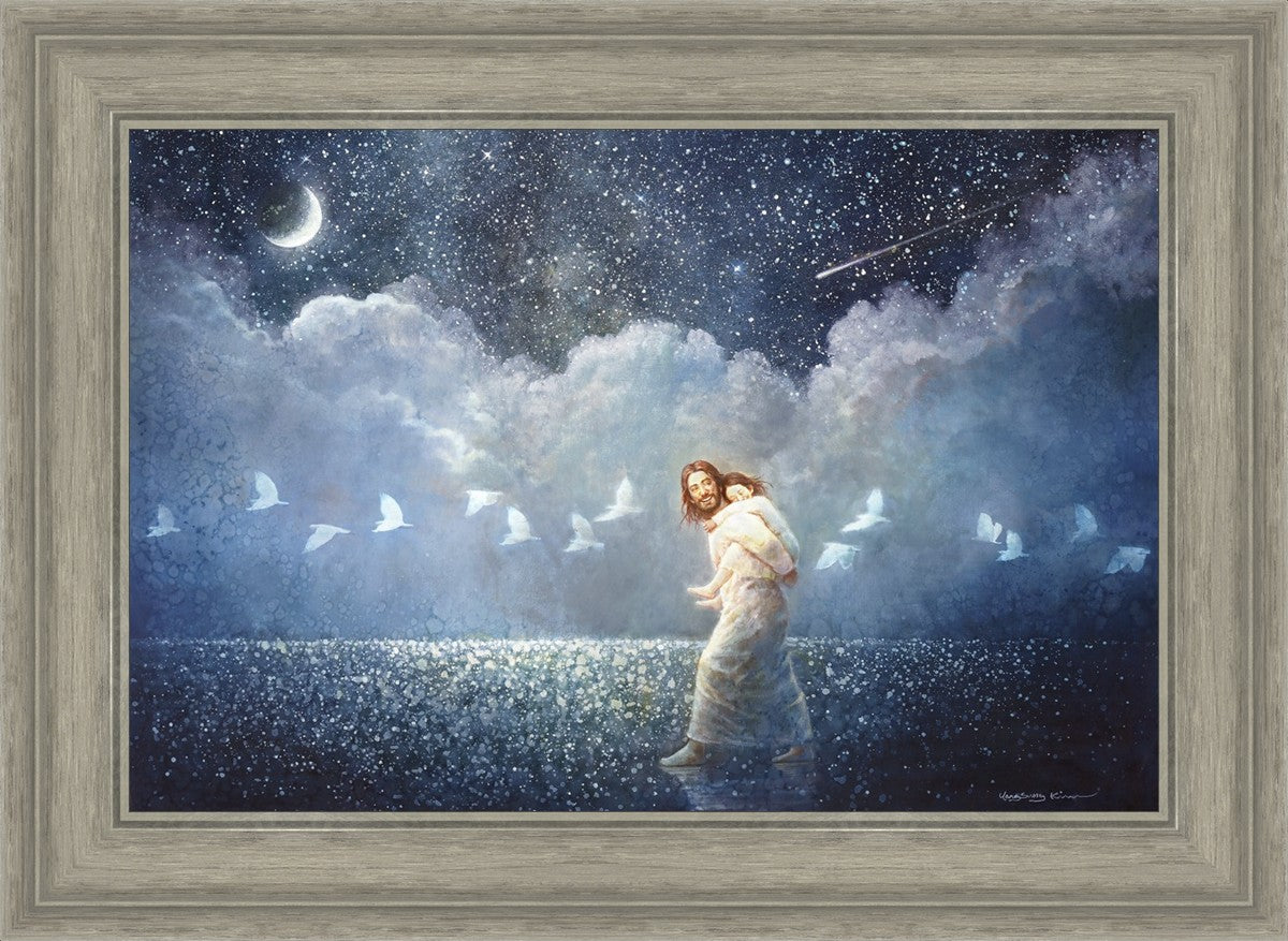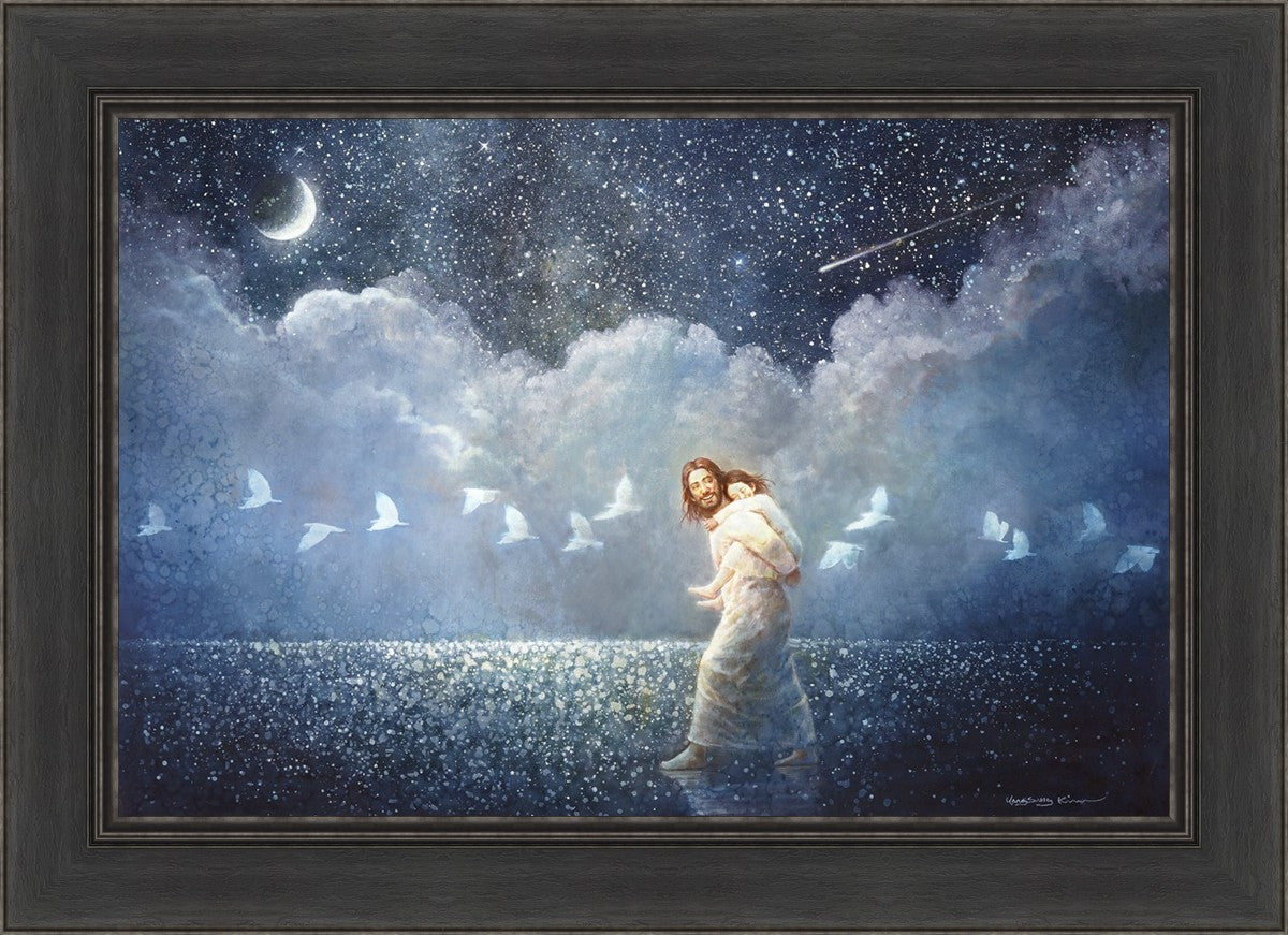 "With All Thy Heart" by Yongsung Kim is a captivating painting featuring Jesus Christ carrying a young girl over water in a dreamlike landscape. This masterpiece showcases celestial elements like the moon, stars, and a comet in the background. Perfect for art enthusiasts seeking spiritual inspiration and tranquility. Purchase this stunning artwork to adorn your space with timeless beauty and divine symbolism. Ideal for home decor, religious spaces, or as a thoughtful gift for loved ones.