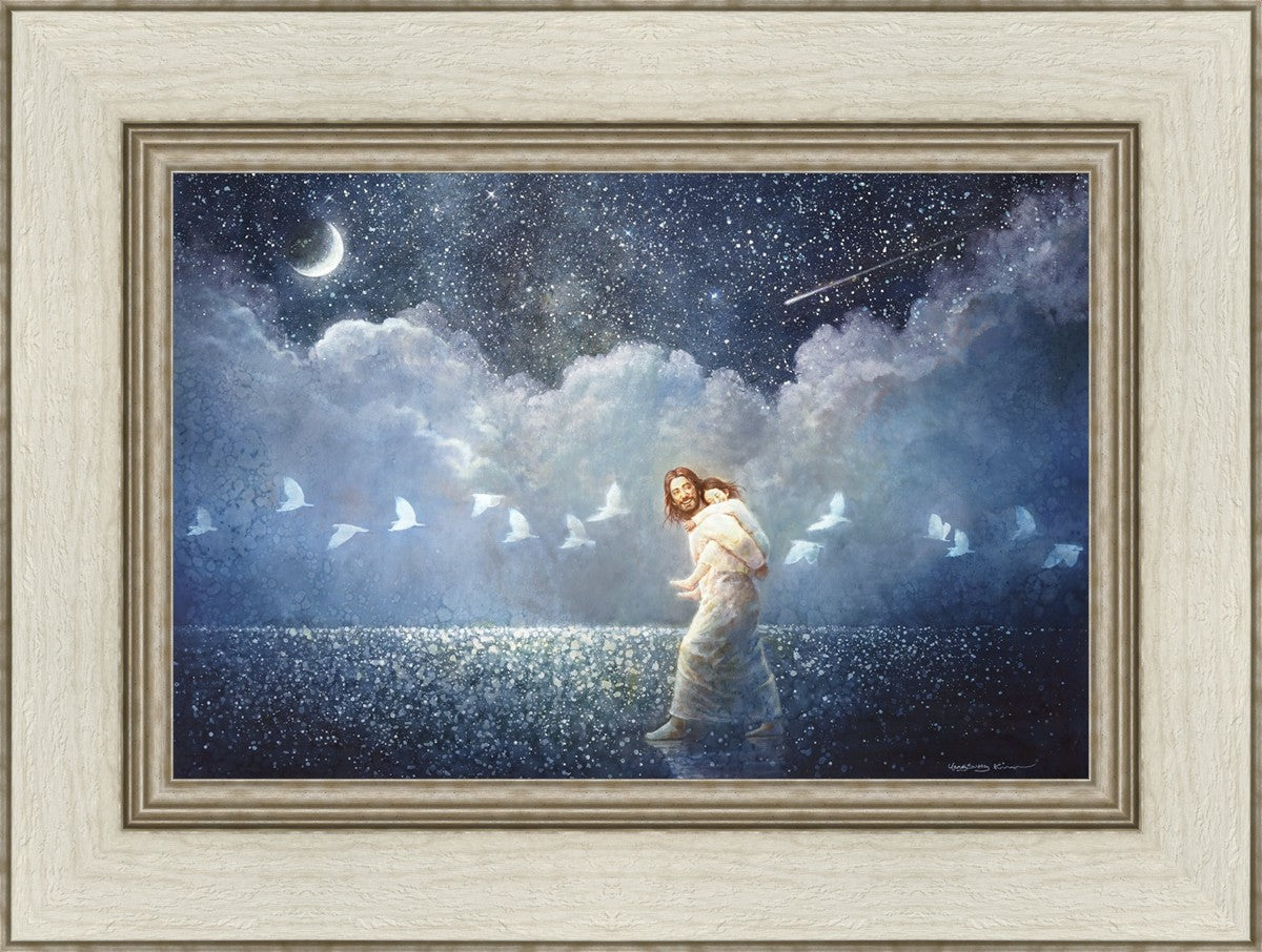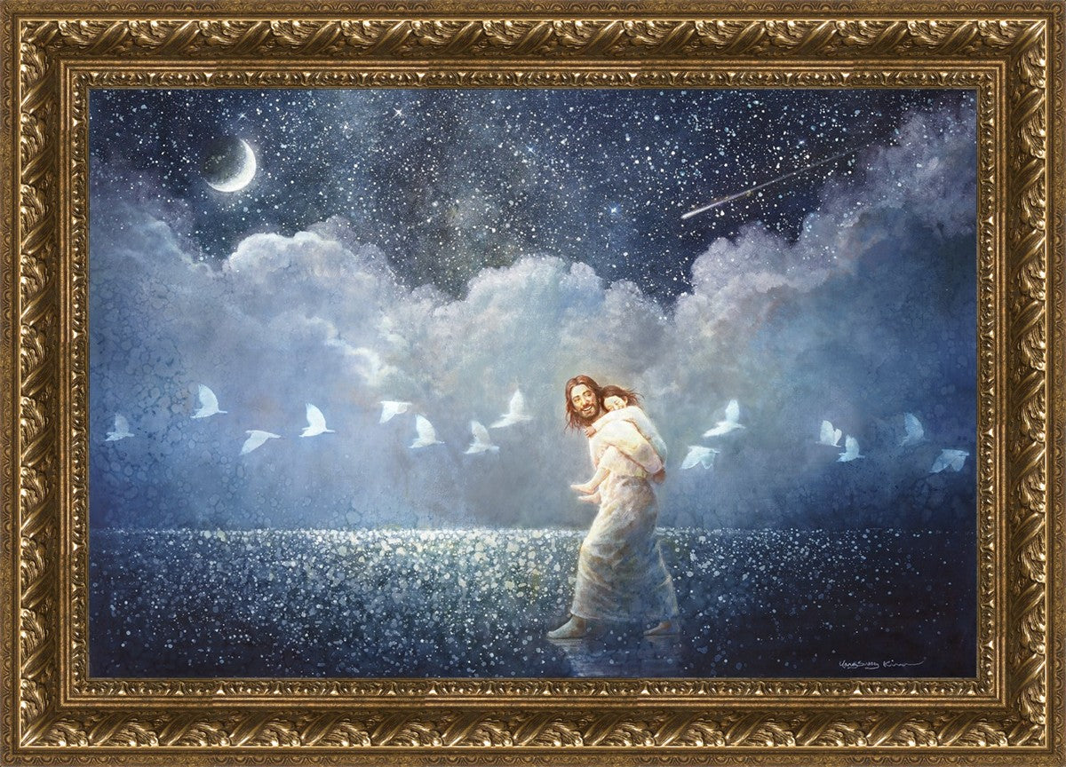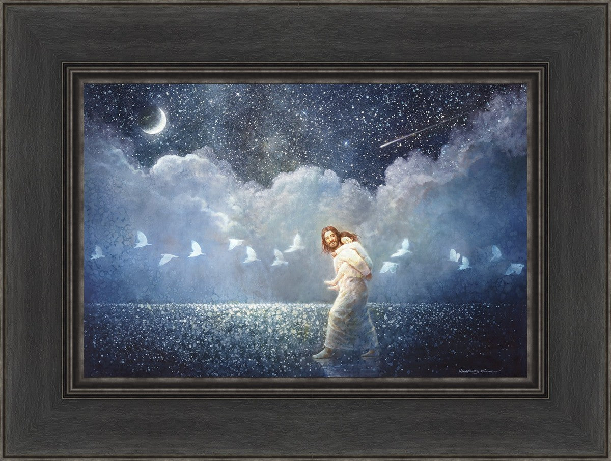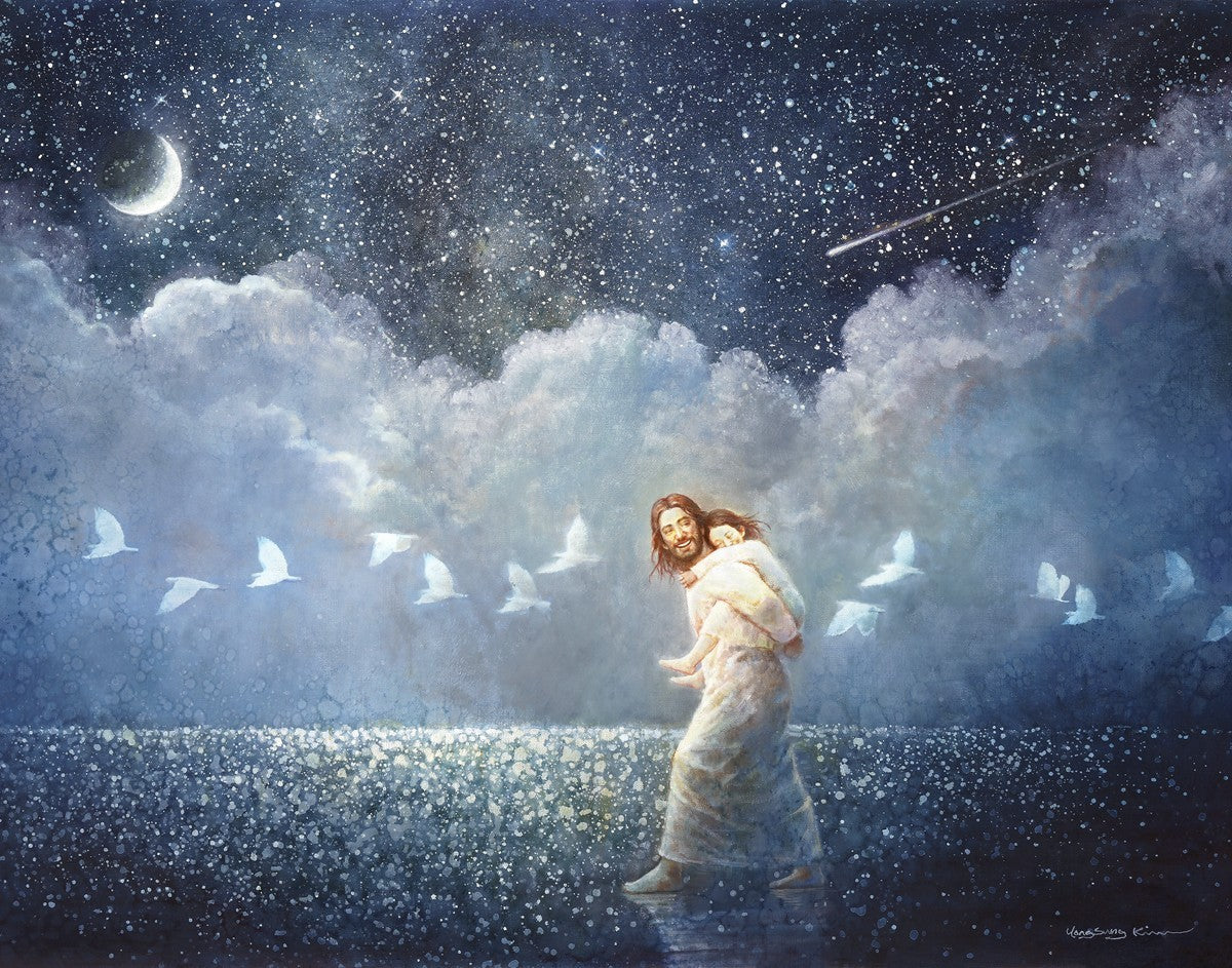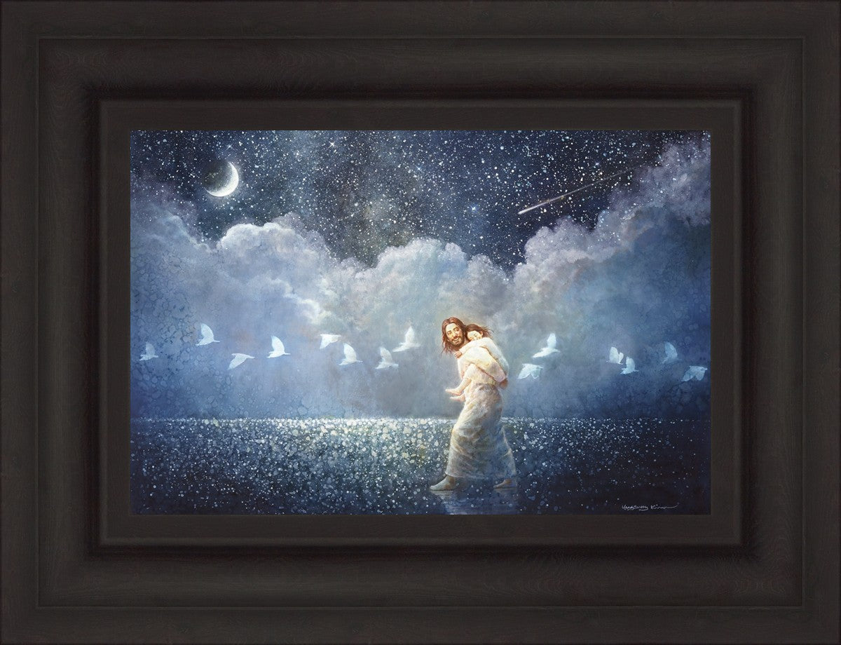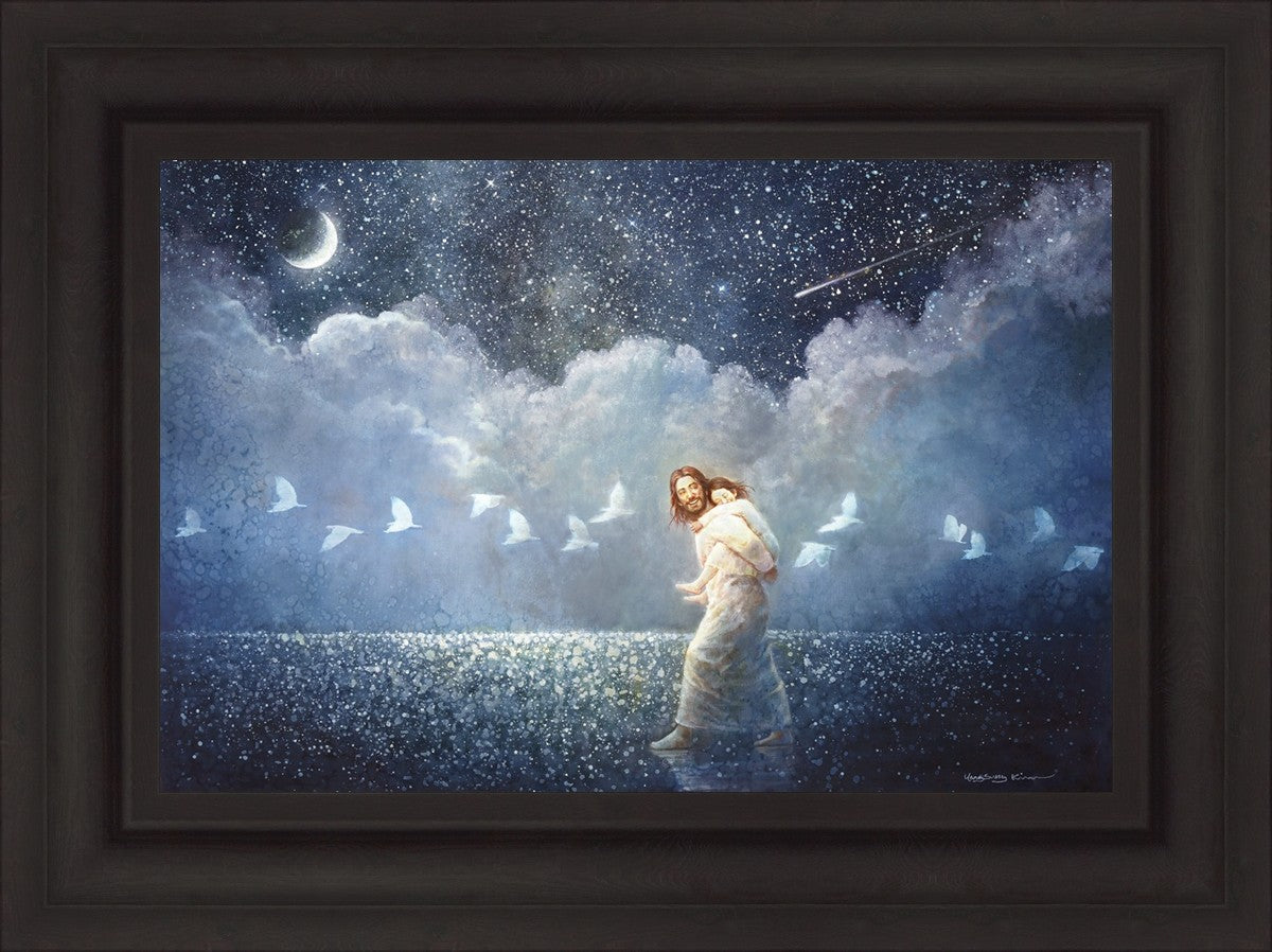 "With All Thy Heart" by Yongsung Kim is a captivating painting featuring Jesus Christ carrying a young girl over water in a dreamlike landscape. This masterpiece showcases celestial elements like the moon, stars, and a comet in the background. Perfect for art enthusiasts seeking spiritual inspiration and tranquility. Purchase this stunning artwork to adorn your space with timeless beauty and divine symbolism. Ideal for home decor, religious spaces, or as a thoughtful gift for loved ones.