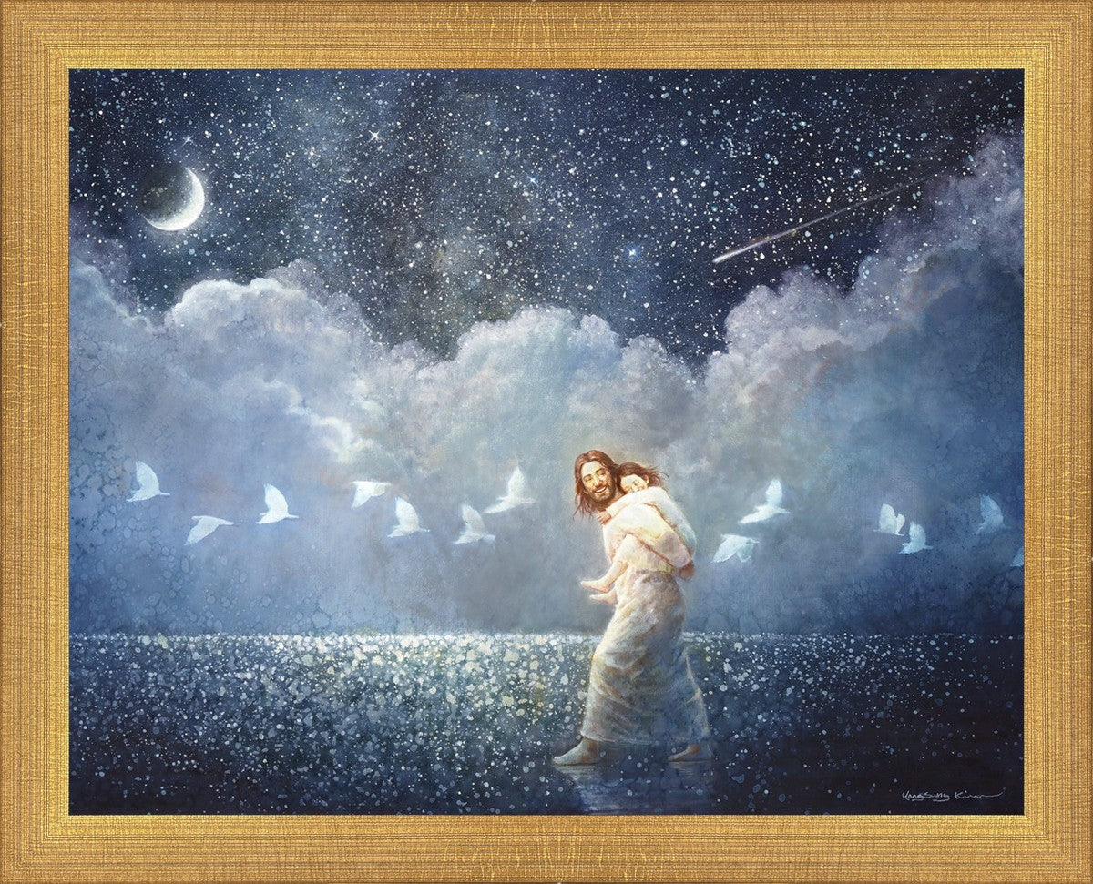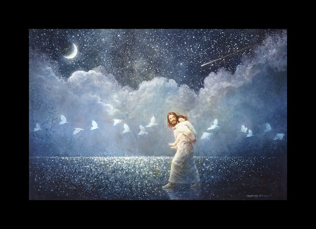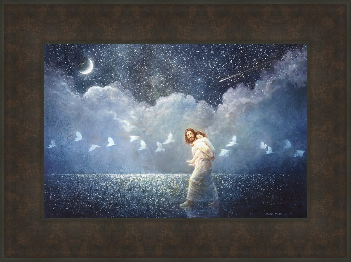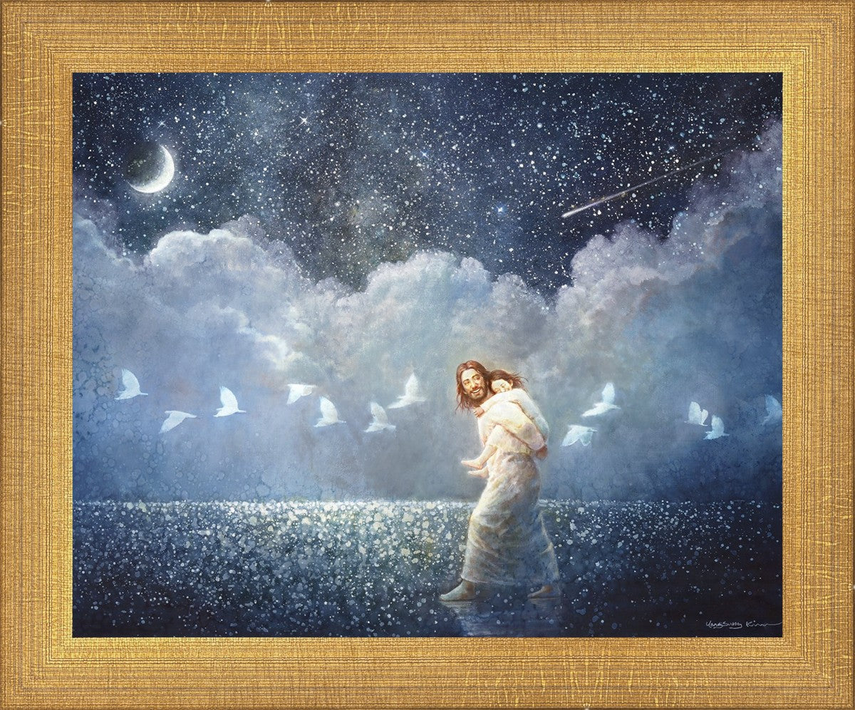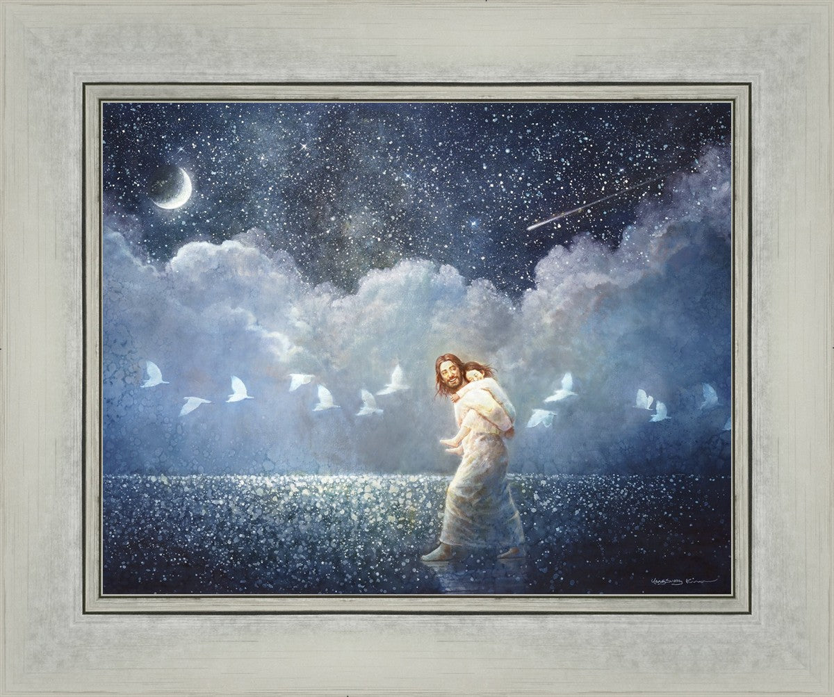 "With All Thy Heart" by Yongsung Kim is a captivating painting featuring Jesus Christ carrying a young girl over water in a dreamlike landscape. This masterpiece showcases celestial elements like the moon, stars, and a comet in the background. Perfect for art enthusiasts seeking spiritual inspiration and tranquility. Purchase this stunning artwork to adorn your space with timeless beauty and divine symbolism. Ideal for home decor, religious spaces, or as a thoughtful gift for loved ones.