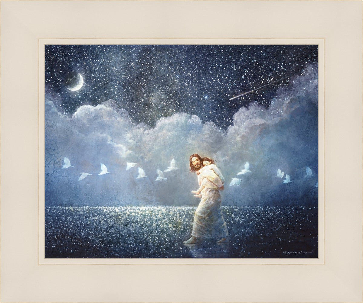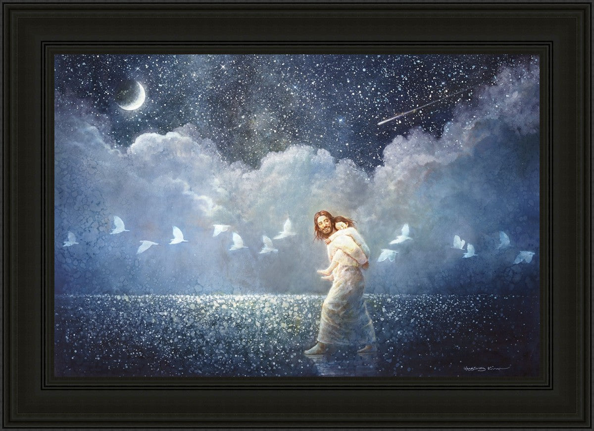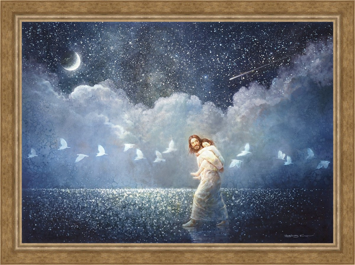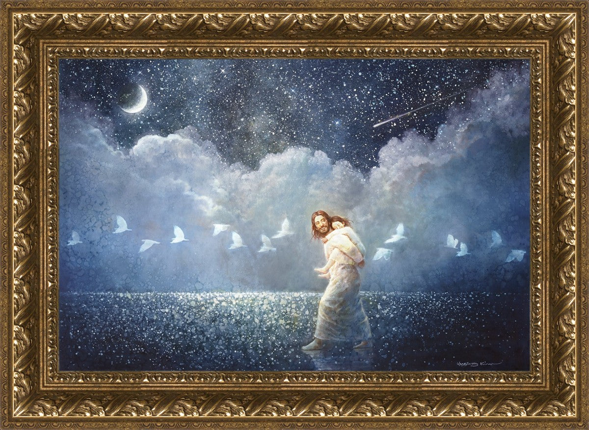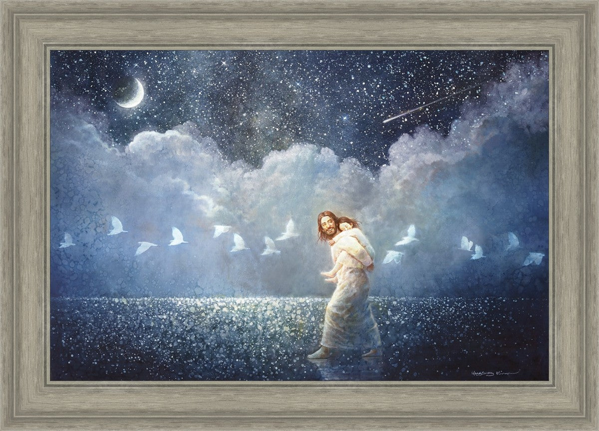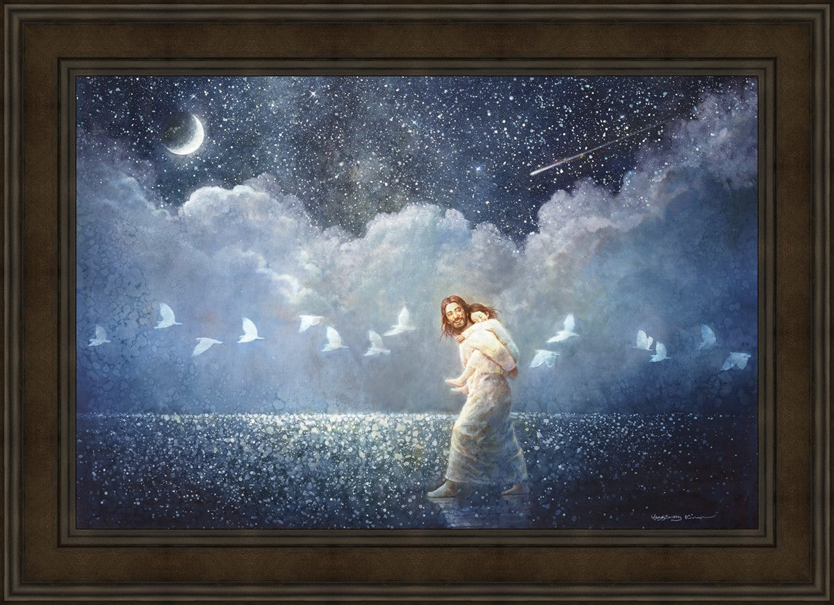 "With All Thy Heart" by Yongsung Kim is a captivating painting featuring Jesus Christ carrying a young girl over water in a dreamlike landscape. This masterpiece showcases celestial elements like the moon, stars, and a comet in the background. Perfect for art enthusiasts seeking spiritual inspiration and tranquility. Purchase this stunning artwork to adorn your space with timeless beauty and divine symbolism. Ideal for home decor, religious spaces, or as a thoughtful gift for loved ones.