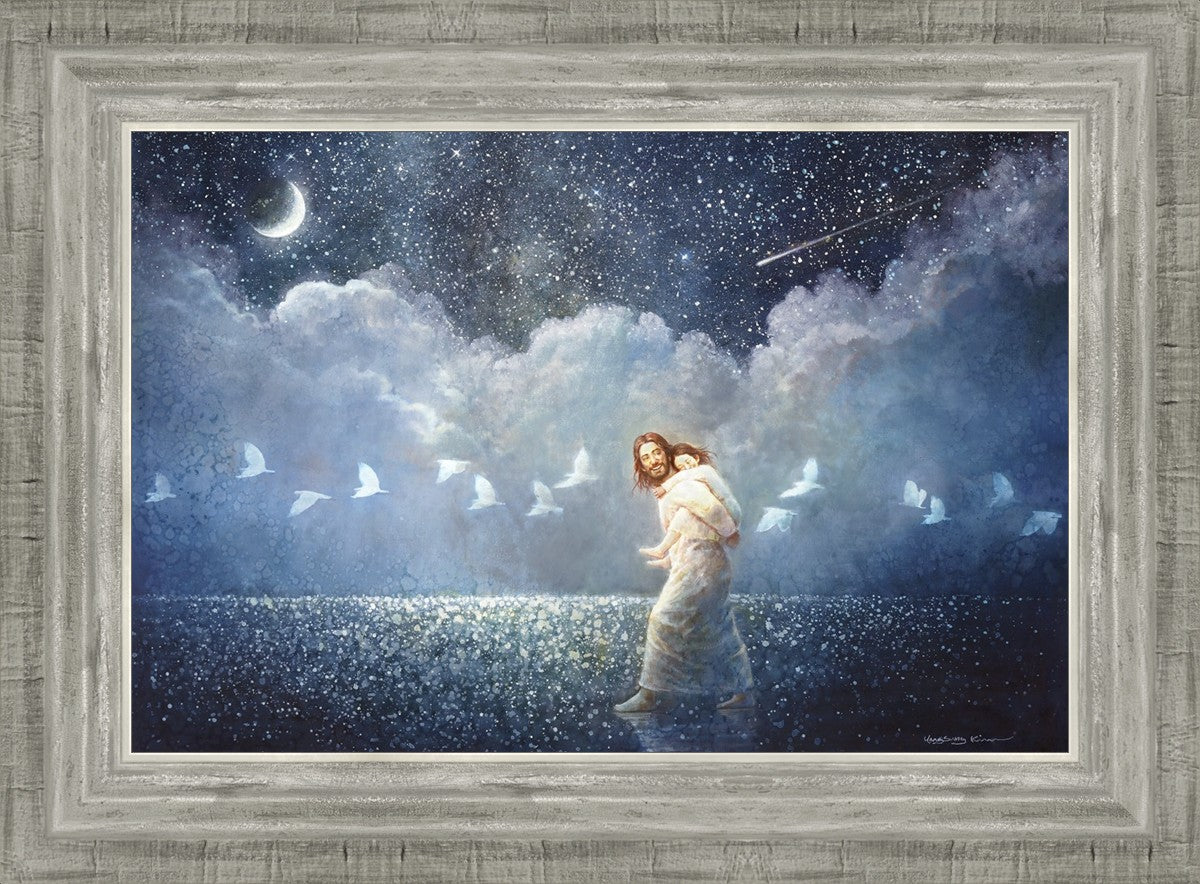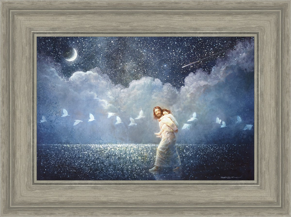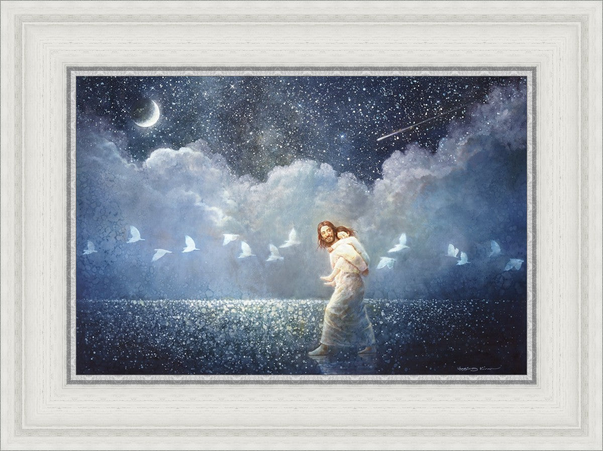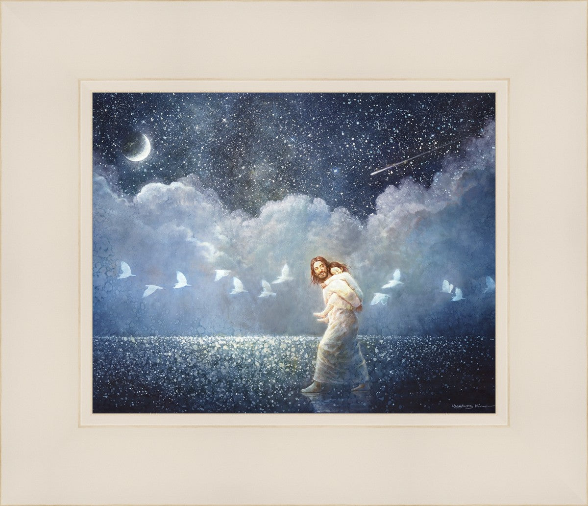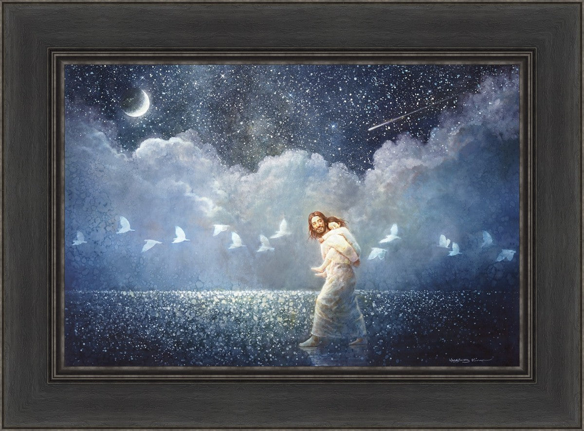 "With All Thy Heart" by Yongsung Kim is a captivating painting featuring Jesus Christ carrying a young girl over water in a dreamlike landscape. This masterpiece showcases celestial elements like the moon, stars, and a comet in the background. Perfect for art enthusiasts seeking spiritual inspiration and tranquility. Purchase this stunning artwork to adorn your space with timeless beauty and divine symbolism. Ideal for home decor, religious spaces, or as a thoughtful gift for loved ones.
