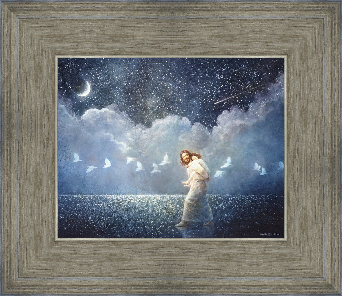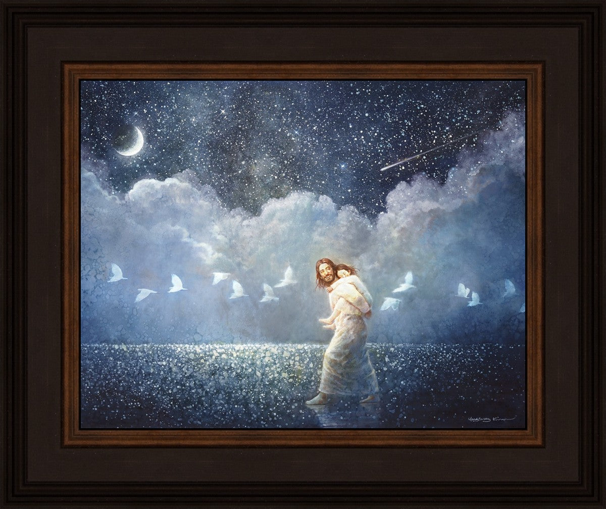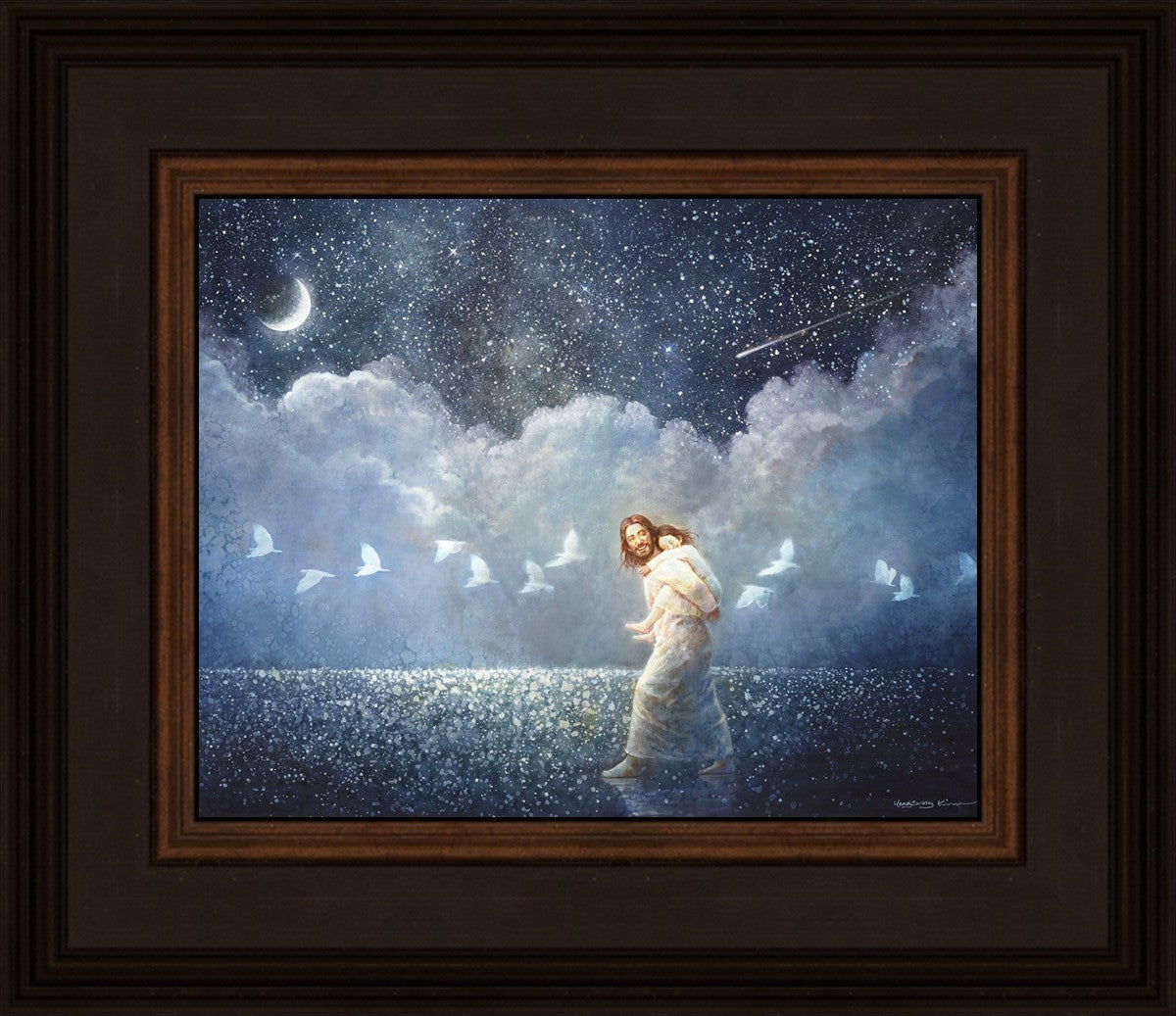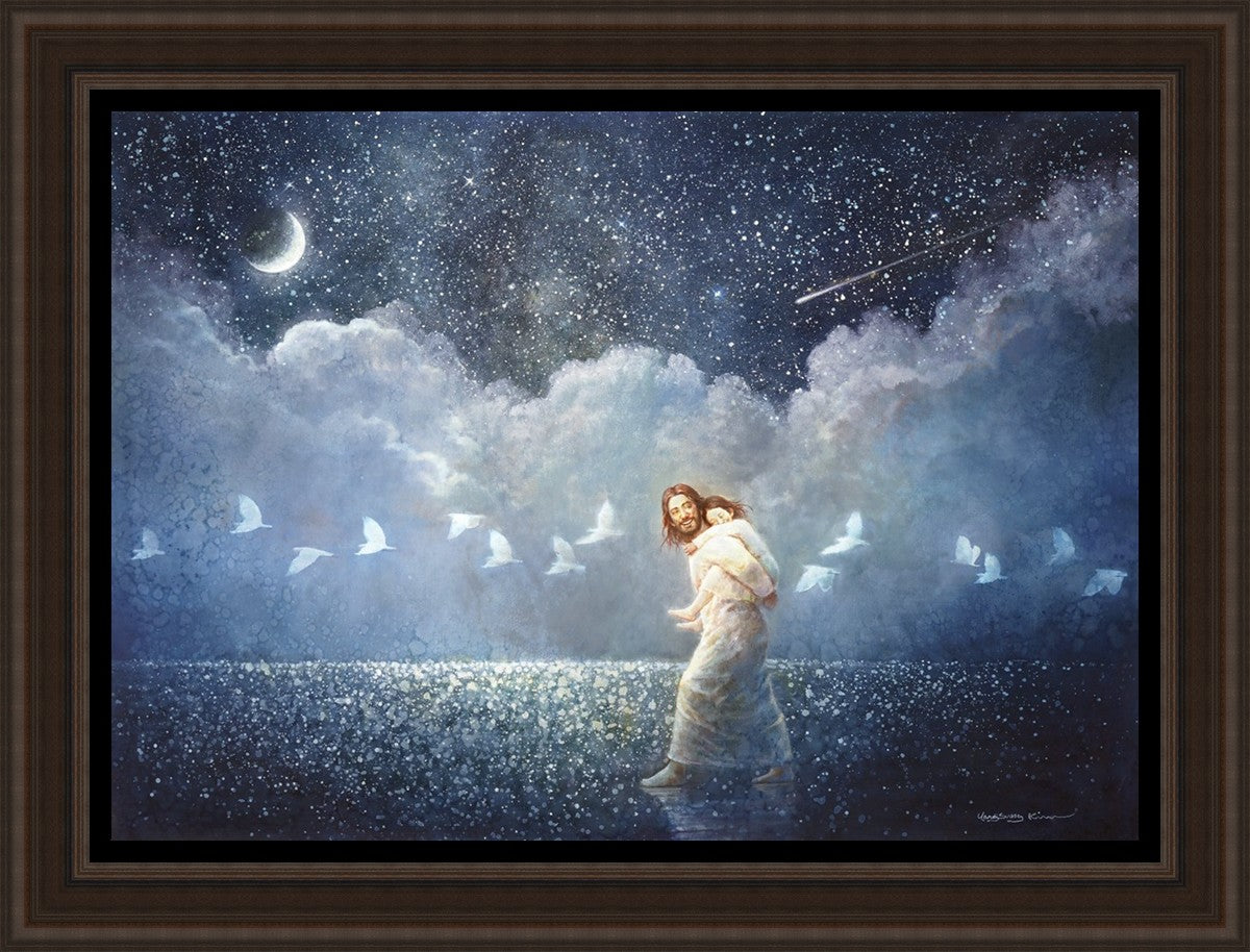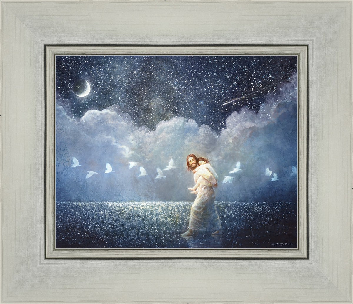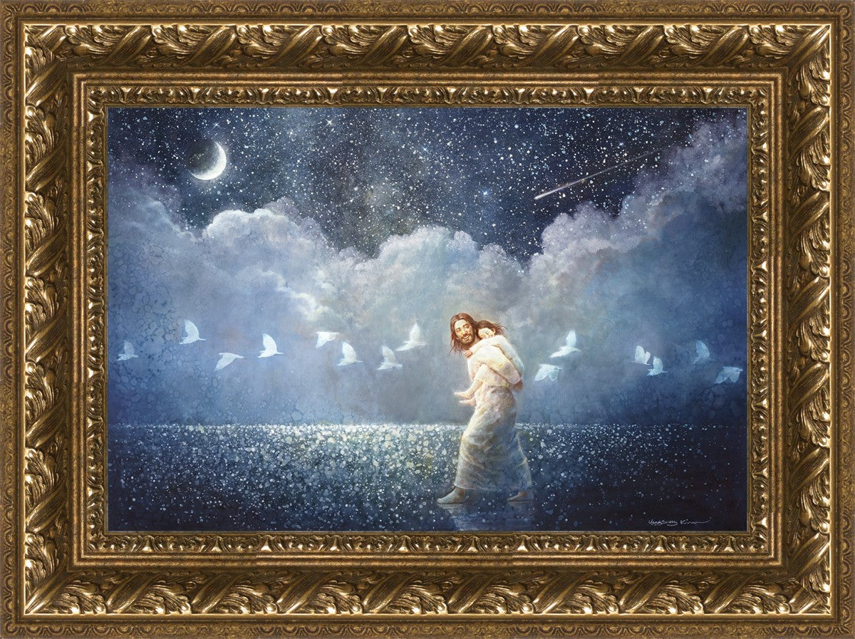 "With All Thy Heart" by Yongsung Kim is a captivating painting featuring Jesus Christ carrying a young girl over water in a dreamlike landscape. This masterpiece showcases celestial elements like the moon, stars, and a comet in the background. Perfect for art enthusiasts seeking spiritual inspiration and tranquility. Purchase this stunning artwork to adorn your space with timeless beauty and divine symbolism. Ideal for home decor, religious spaces, or as a thoughtful gift for loved ones.