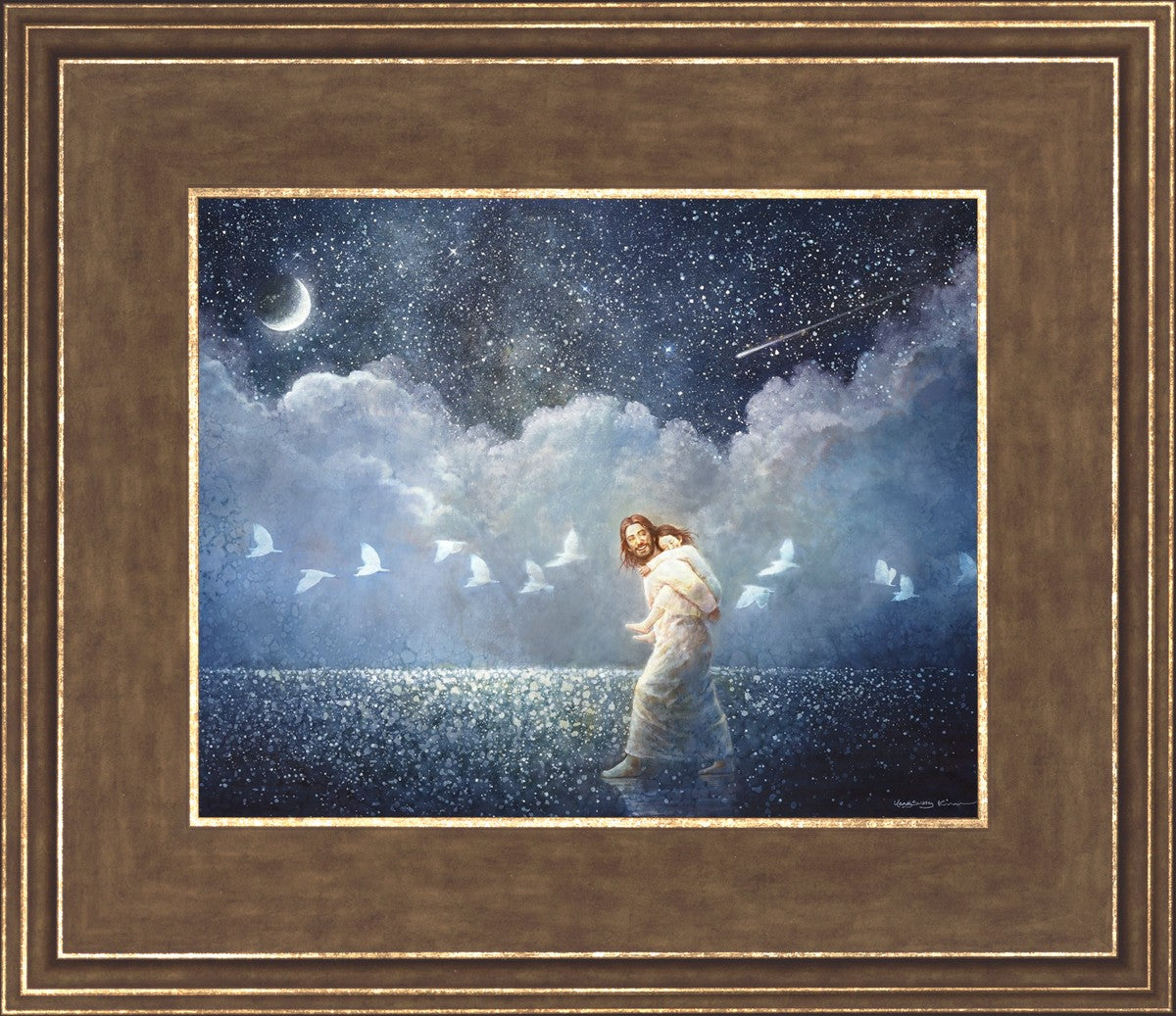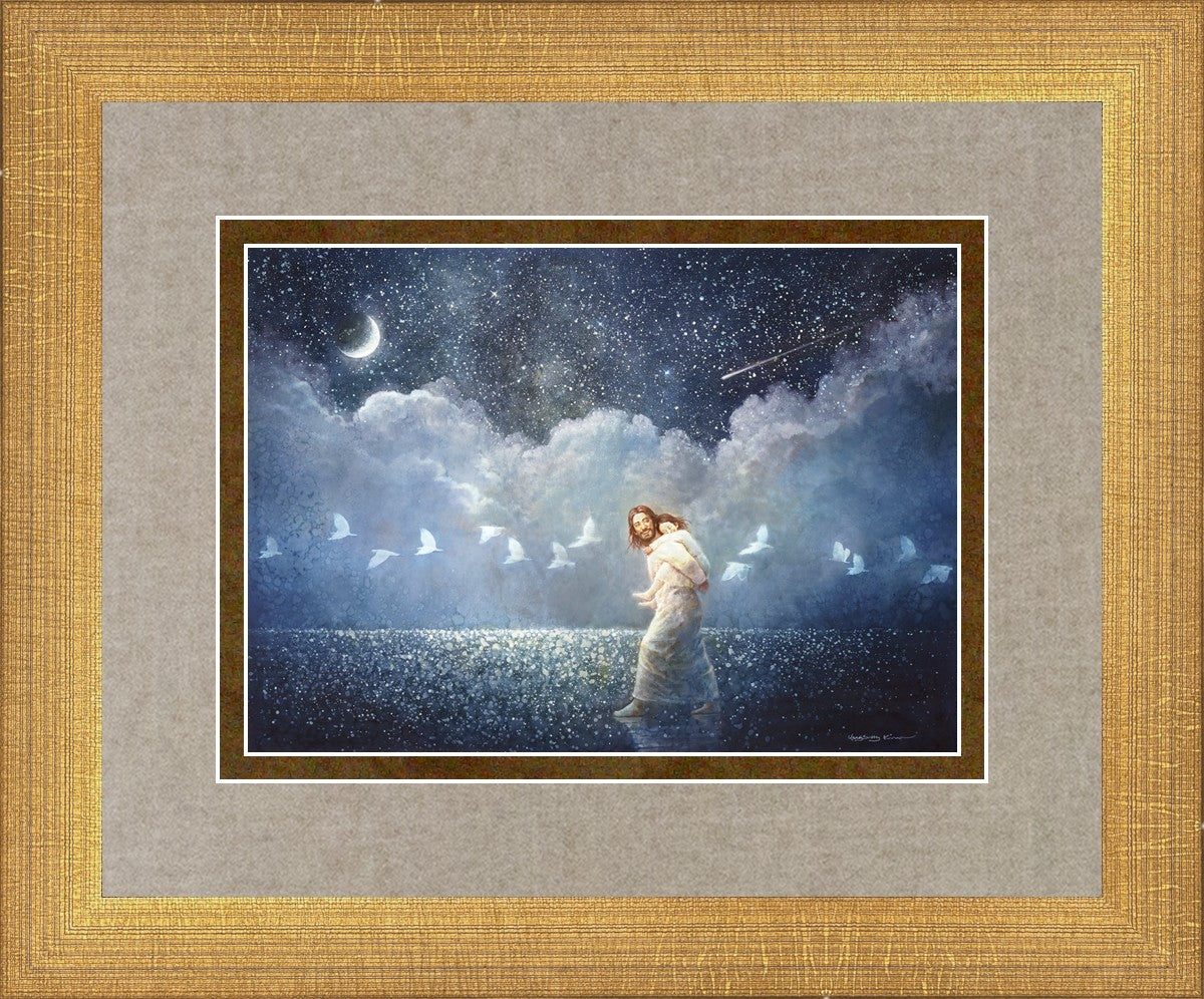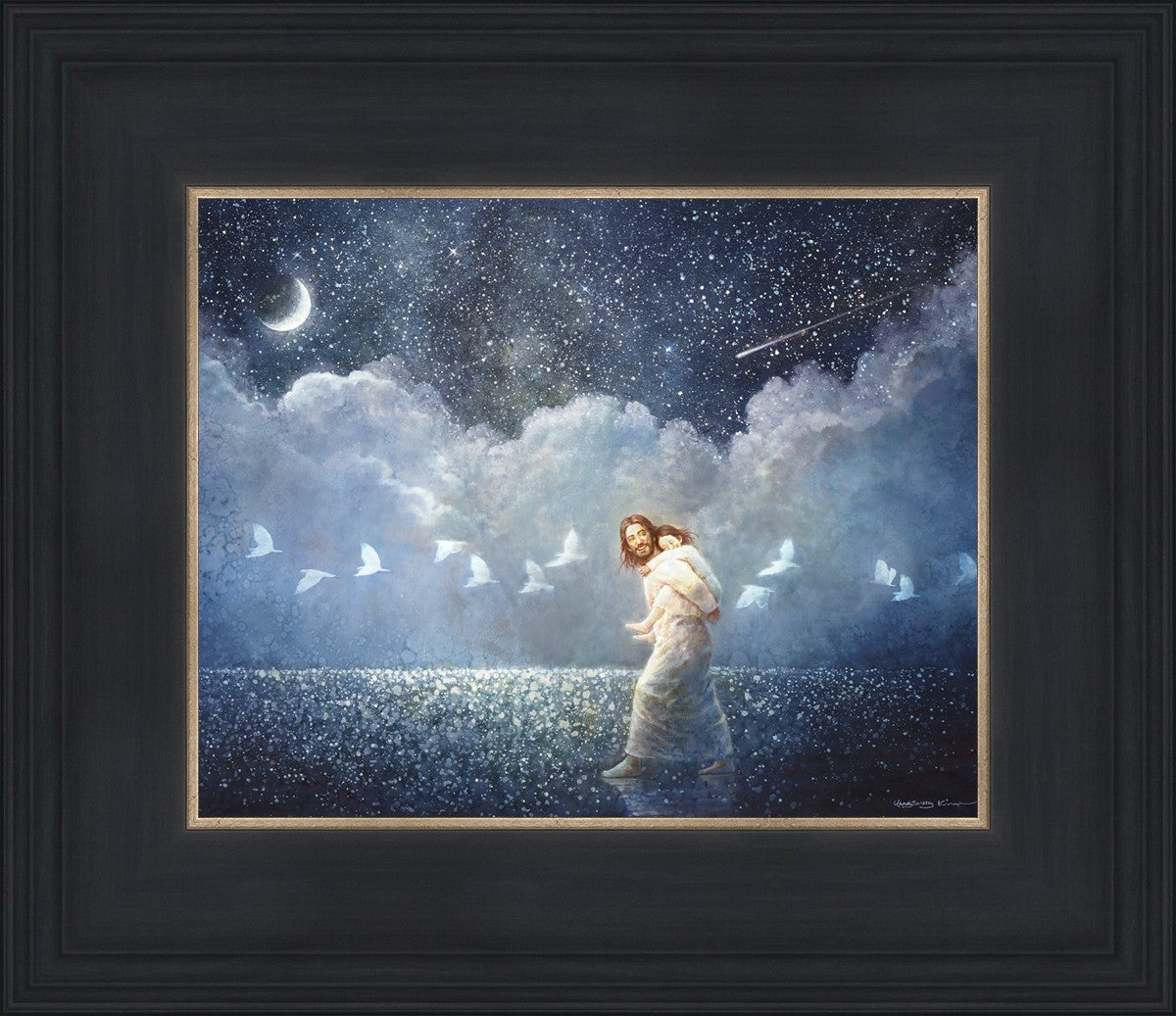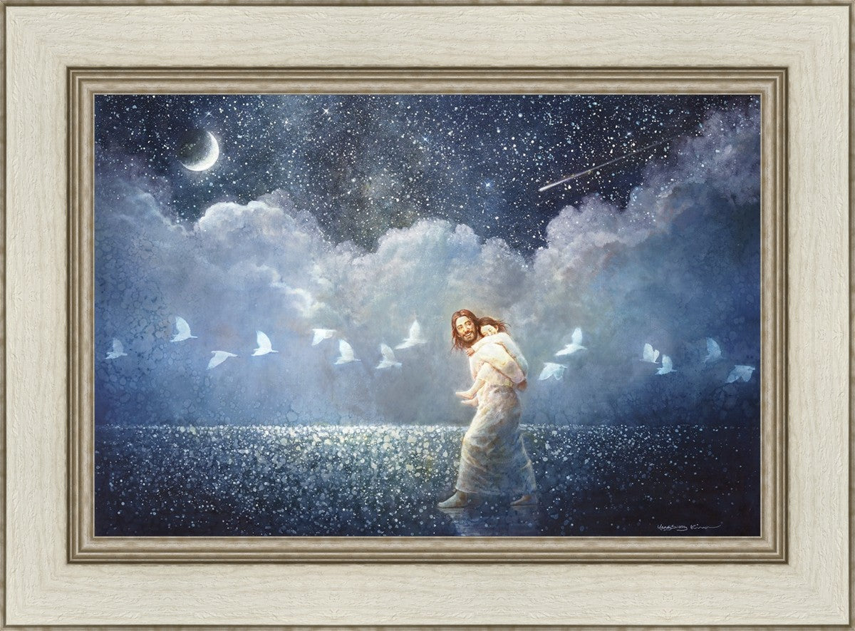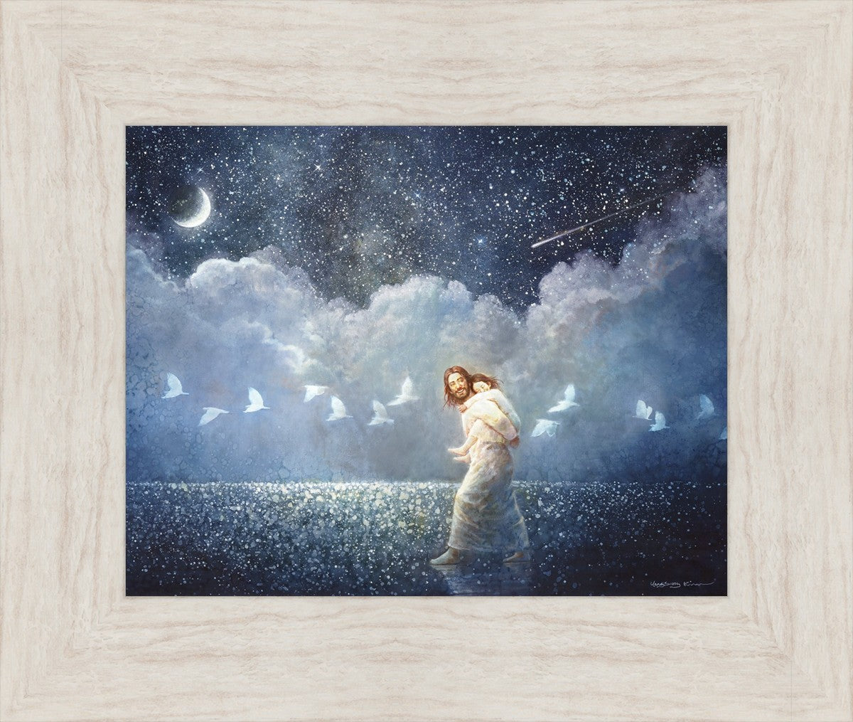 "With All Thy Heart" by Yongsung Kim is a captivating painting featuring Jesus Christ carrying a young girl over water in a dreamlike landscape. This masterpiece showcases celestial elements like the moon, stars, and a comet in the background. Perfect for art enthusiasts seeking spiritual inspiration and tranquility. Purchase this stunning artwork to adorn your space with timeless beauty and divine symbolism. Ideal for home decor, religious spaces, or as a thoughtful gift for loved ones.