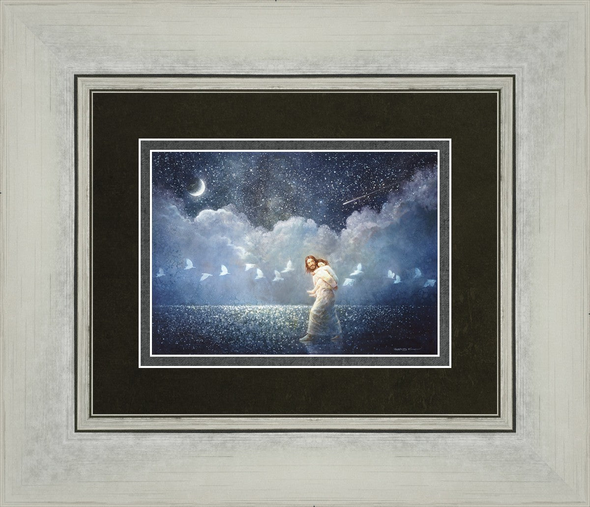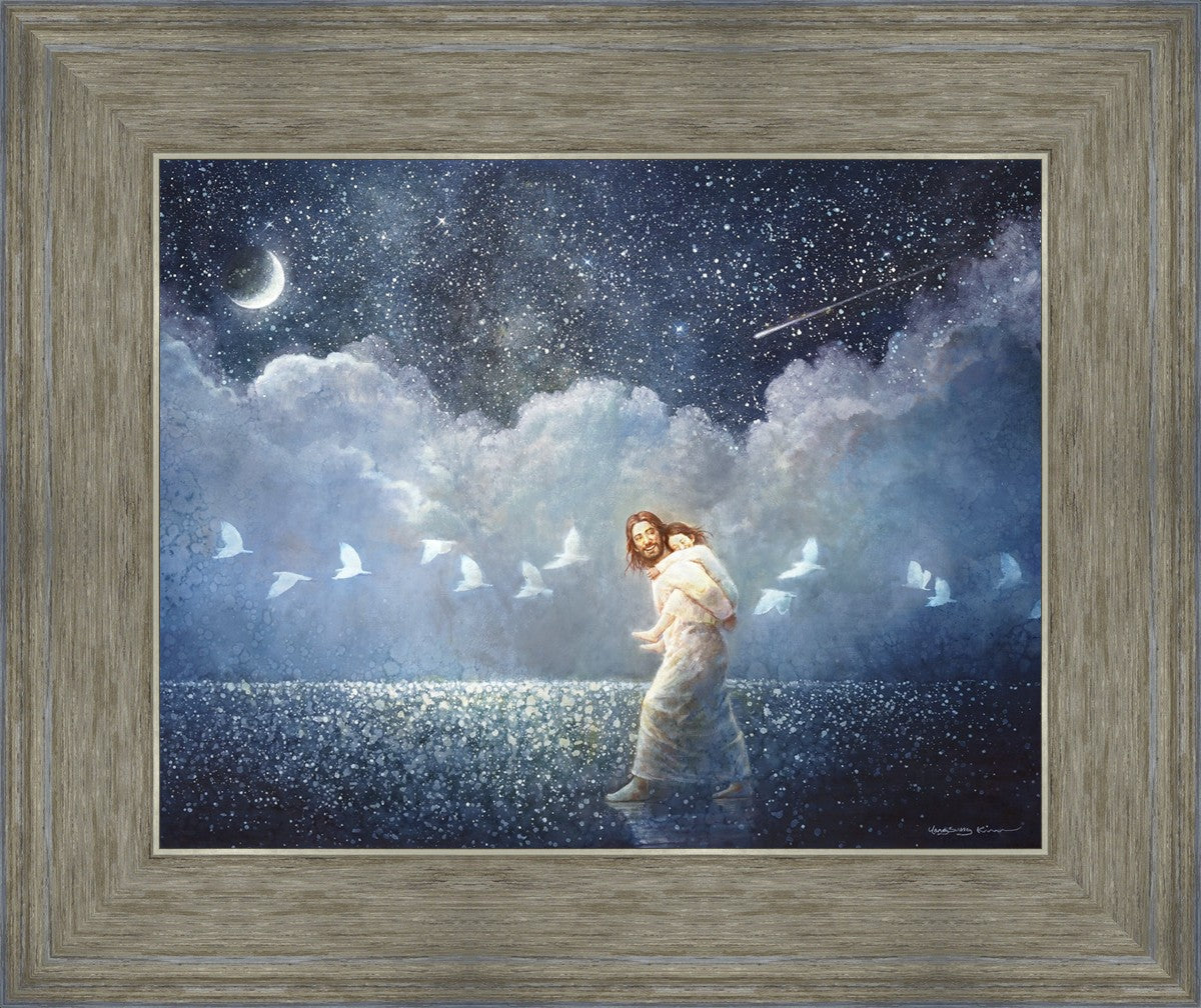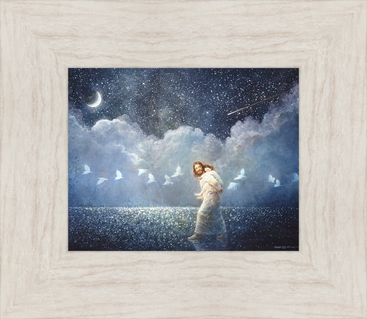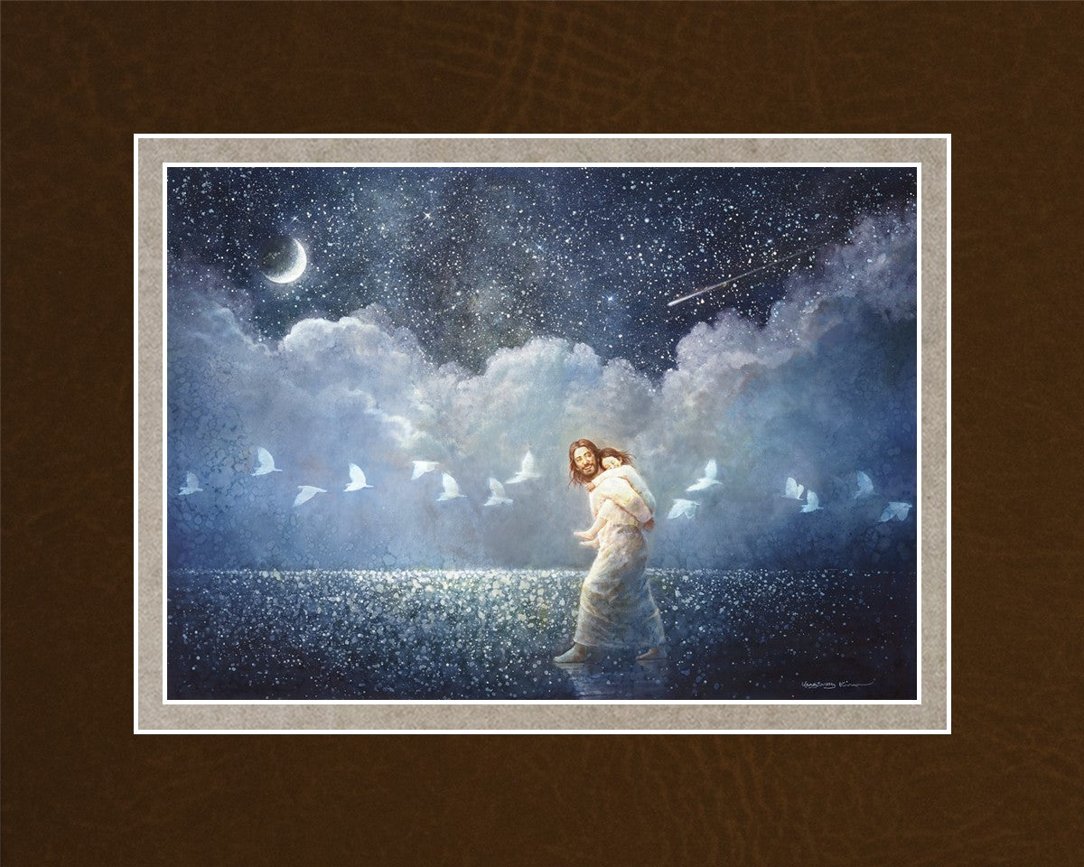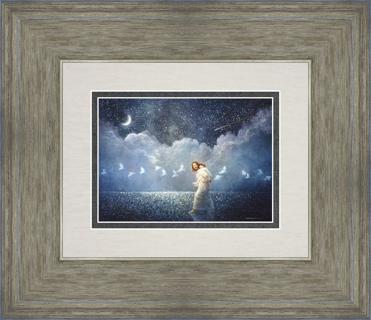 "With All Thy Heart" by Yongsung Kim is a captivating painting featuring Jesus Christ carrying a young girl over water in a dreamlike landscape. This masterpiece showcases celestial elements like the moon, stars, and a comet in the background. Perfect for art enthusiasts seeking spiritual inspiration and tranquility. Purchase this stunning artwork to adorn your space with timeless beauty and divine symbolism. Ideal for home decor, religious spaces, or as a thoughtful gift for loved ones.