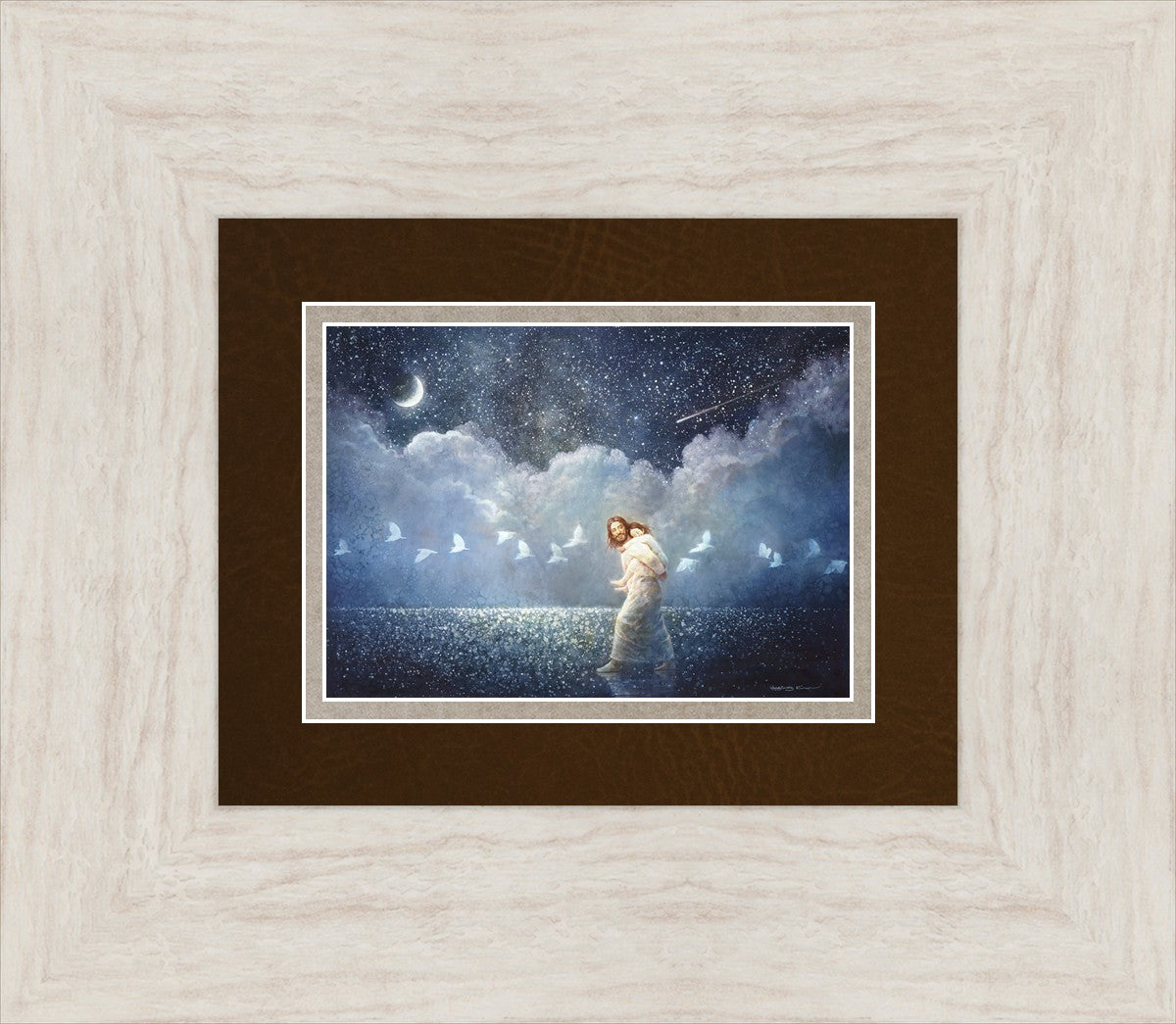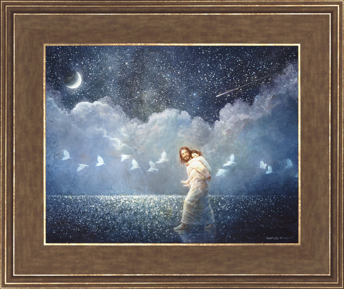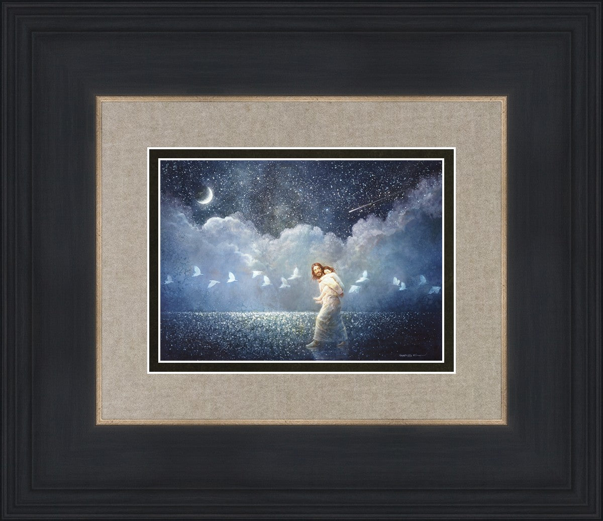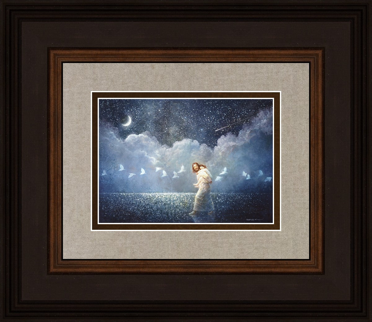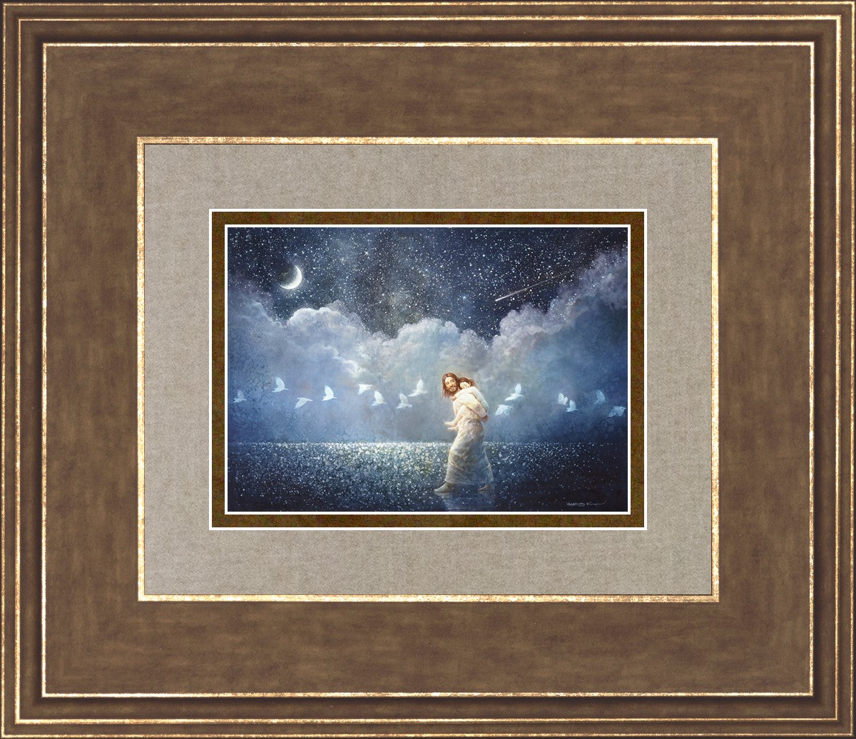 "With All Thy Heart" by Yongsung Kim is a captivating painting featuring Jesus Christ carrying a young girl over water in a dreamlike landscape. This masterpiece showcases celestial elements like the moon, stars, and a comet in the background. Perfect for art enthusiasts seeking spiritual inspiration and tranquility. Purchase this stunning artwork to adorn your space with timeless beauty and divine symbolism. Ideal for home decor, religious spaces, or as a thoughtful gift for loved ones.