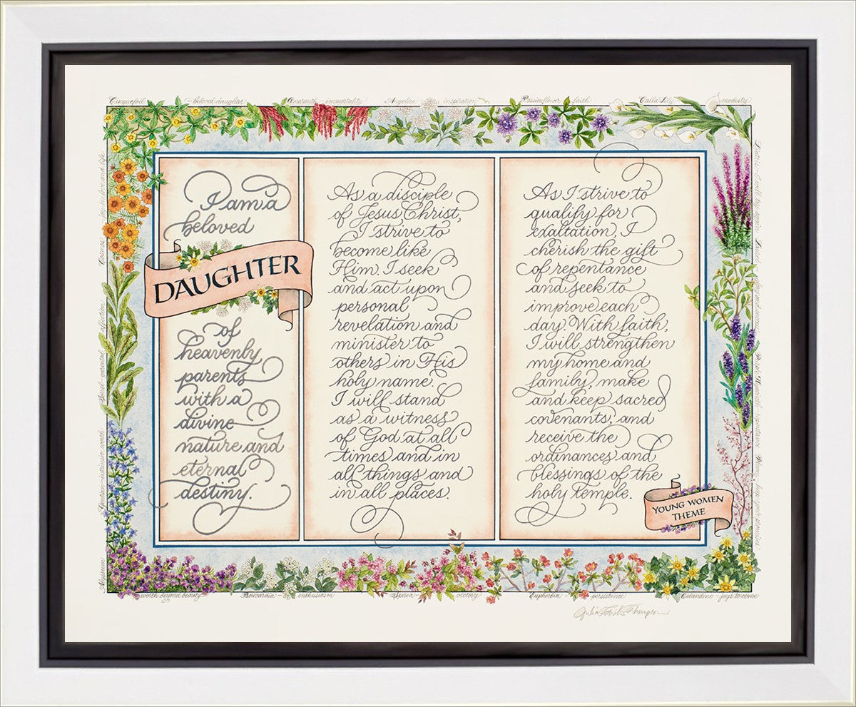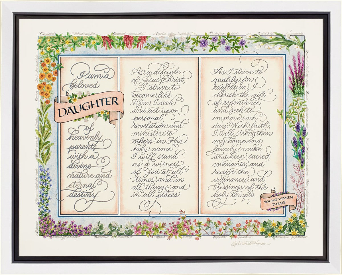I love to use symbols in my work and for this piece I turned to Victorian flower meanings. Since these are not part of our cultures everyday vocabulary, I wrote the meanings of each flower or plant for the viewers reference. Here they are, from the top left corner going clockwise: Cinquefoil — beloved daughter; Amaranth — immortality; Angelica — inspiration; Passionflower — faith; Calla Lily — modesty; Liatris — "I will try again"; Laurel — glory and success; Purple Hyacinth — repentance; Plum — keep your promises; Celandine — joys to come; Euphorbia — persistence; Spirea — victory; Bouvardia — enthusiasm; Alyssum — worth beyond beauty; Gentian — intrinsic worth; Sorrel — parental affection; Cosmos — joy in love and life. I tried to keep the floral symbol close to the words while still balancing the colors and shapes in the border. I consulted some young women I know to choose the lettering style and settled on a monoline cursive, which is feminine and popular today.